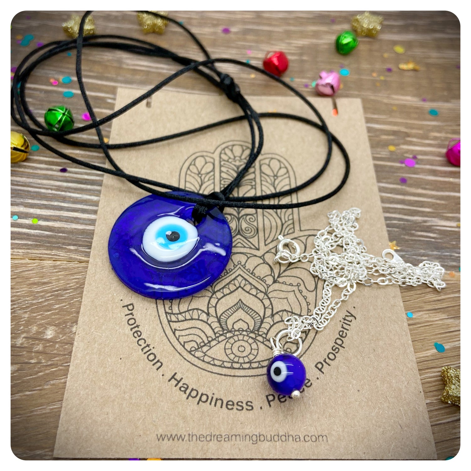 This glass Evil eye pendant necklace set is the perfect accessory for anyone needing a little protection in life.