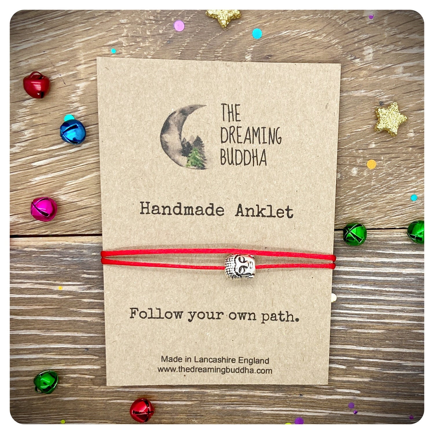 The anklets are mounted on recycled card and carefully wrapped in a clear cellophane sleeve.