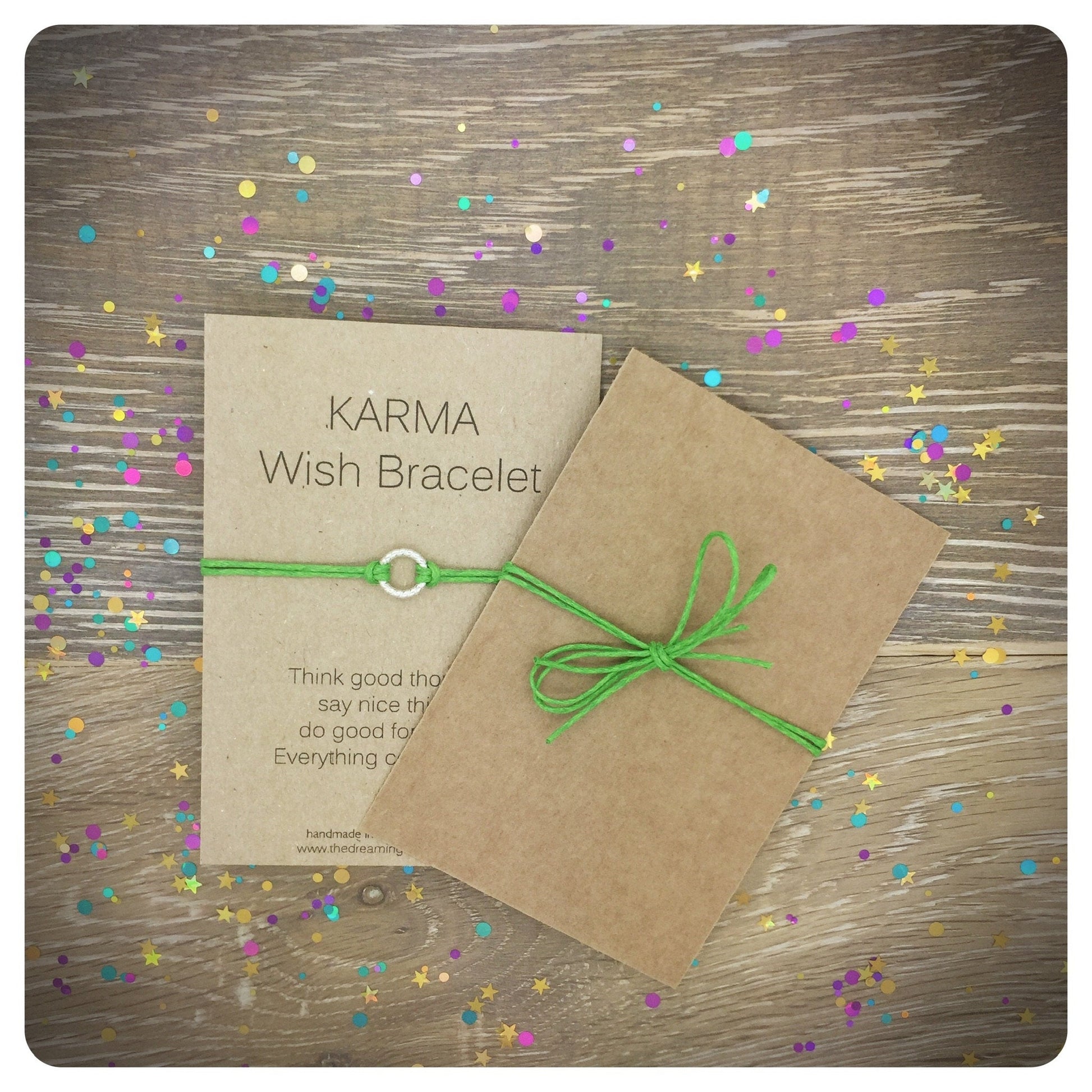 These handmade wish bracelet cards read - KARMA Think good thoughts, say nice things, do good for others. Everything comes back.