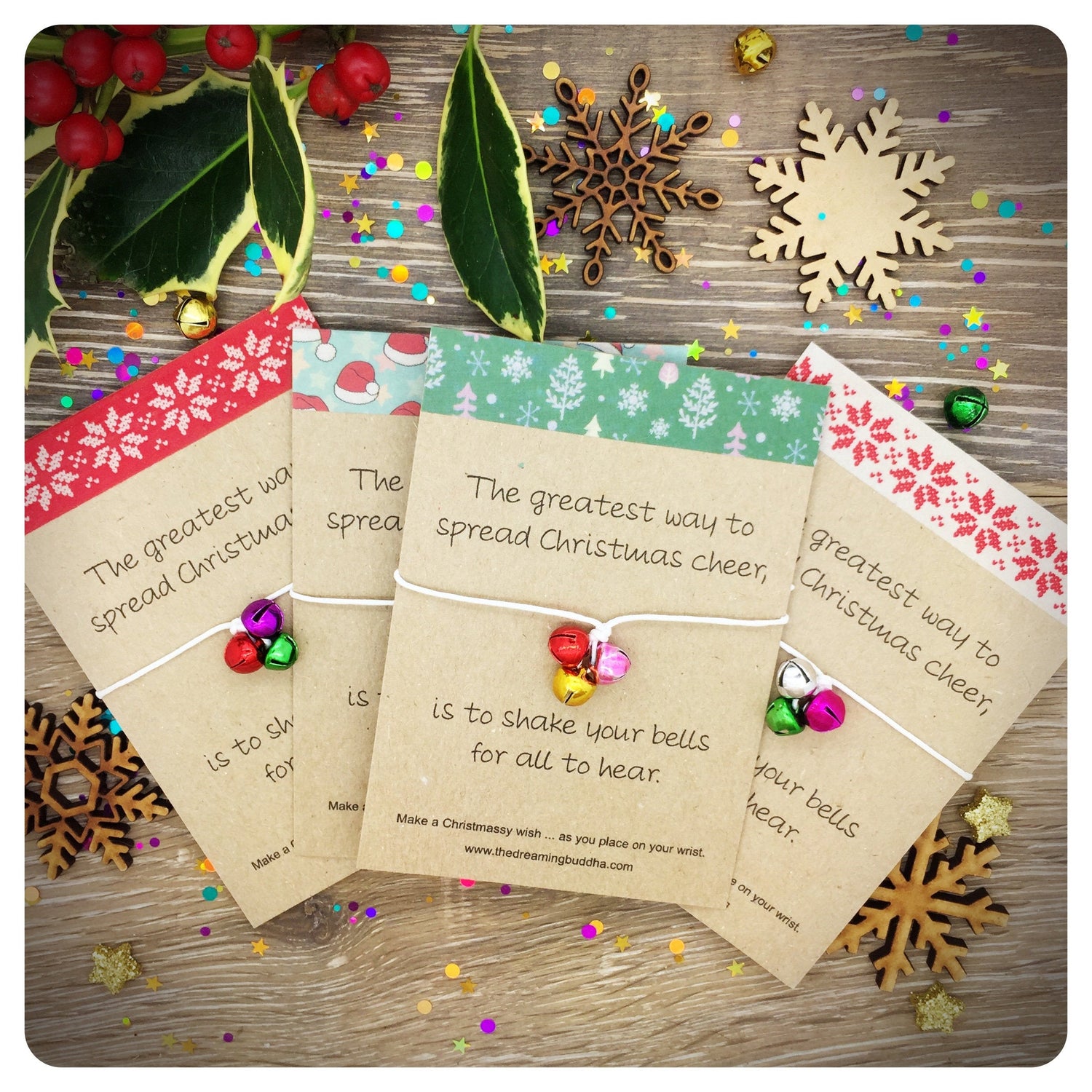 4 x Elf Christmas Cards, Wish Bracelets, Jingle Bells Gift, Childrens Stocking Filler, Jingle Bells Wishlet, Secret Santa