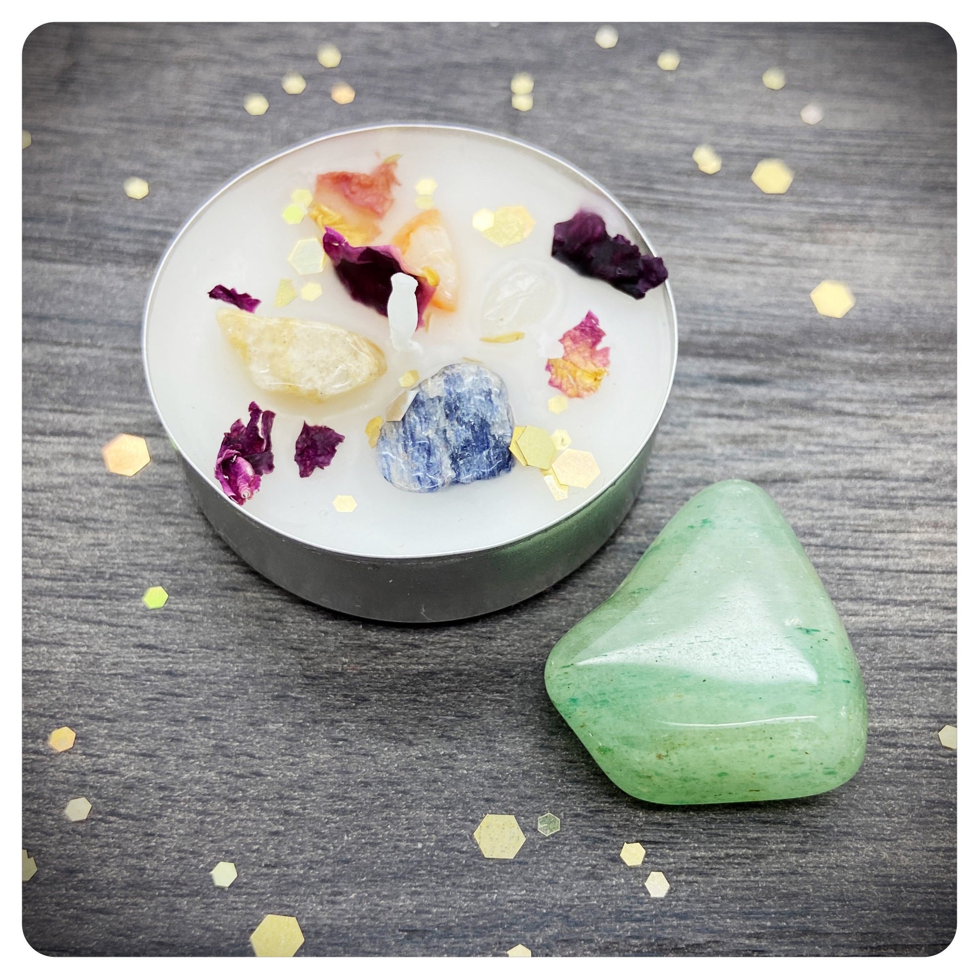 A wonderful gift for yourself or a friend, this cute little box contains a genuine Aventurine tumblestone and tea light candle, decorated with small gemstones, rose petals and biodegradable glitter.