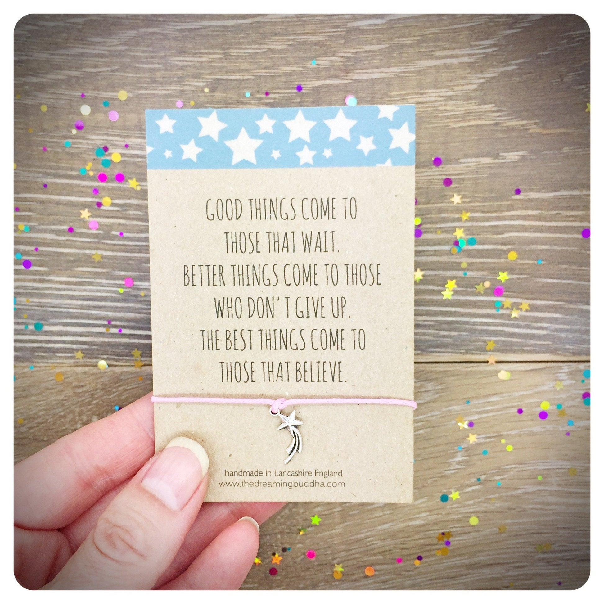 This handmade wish bracelet card reads - Good things come to those that wait. Better things come to those who don’t give up. The best things come to those that believe.