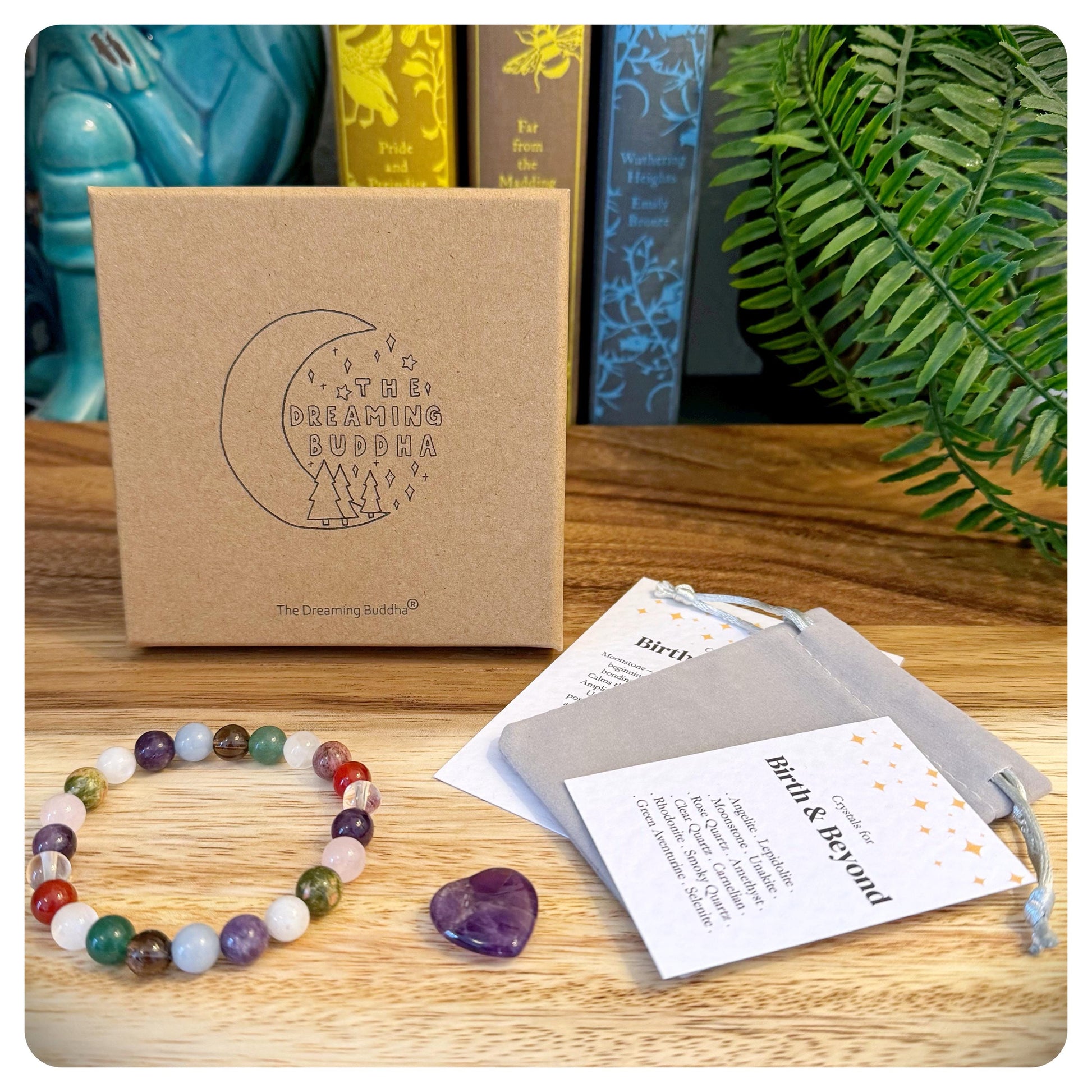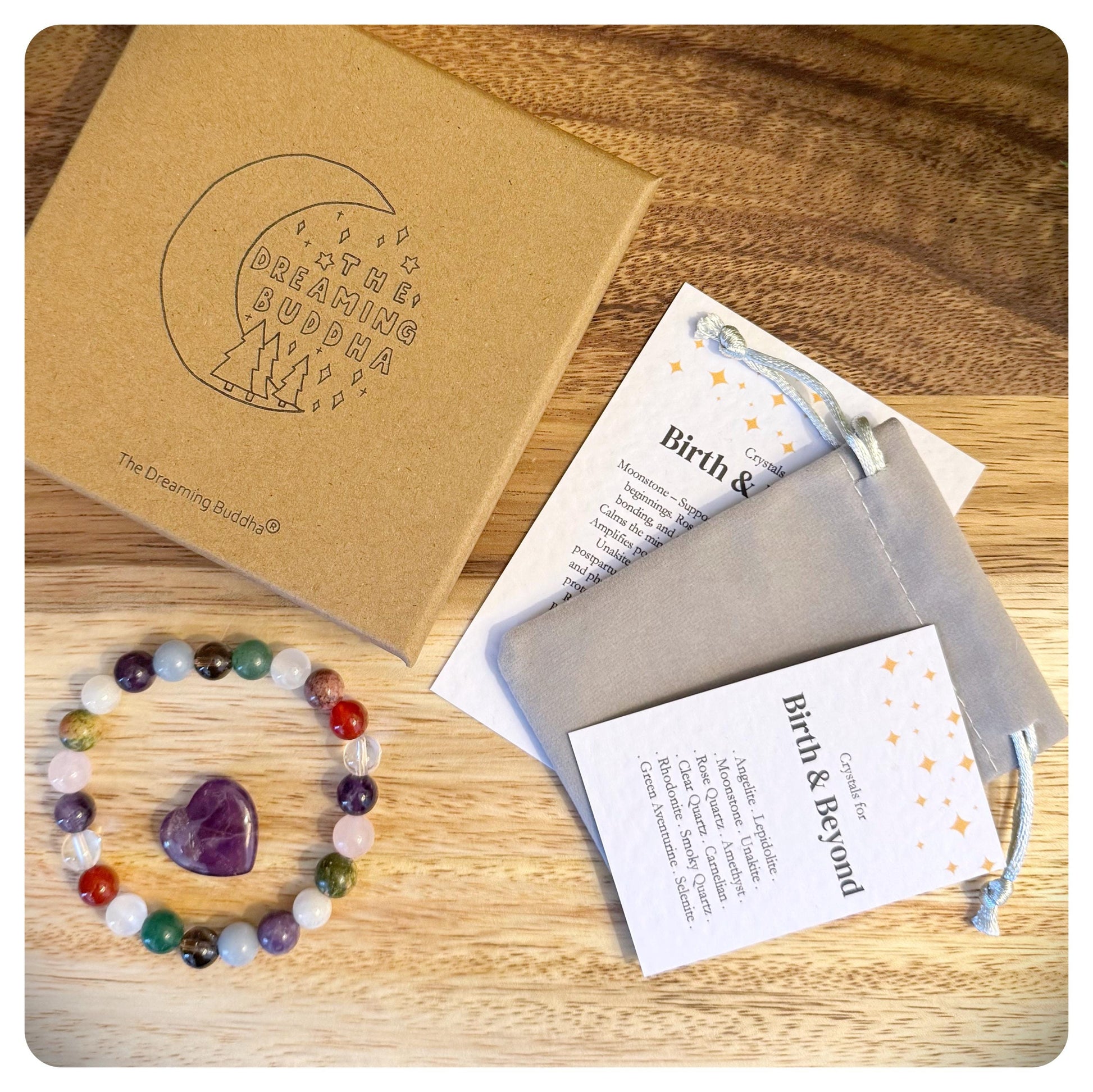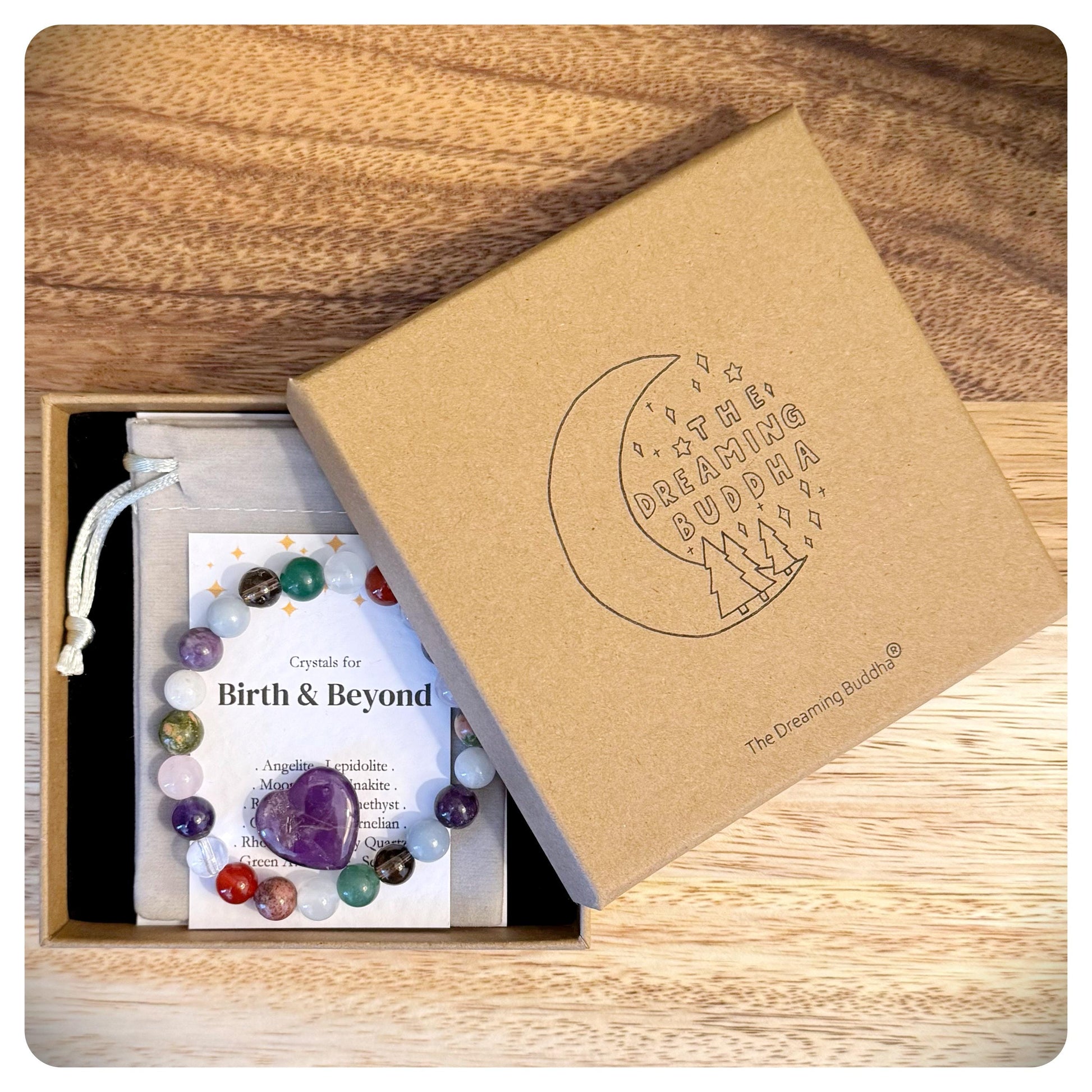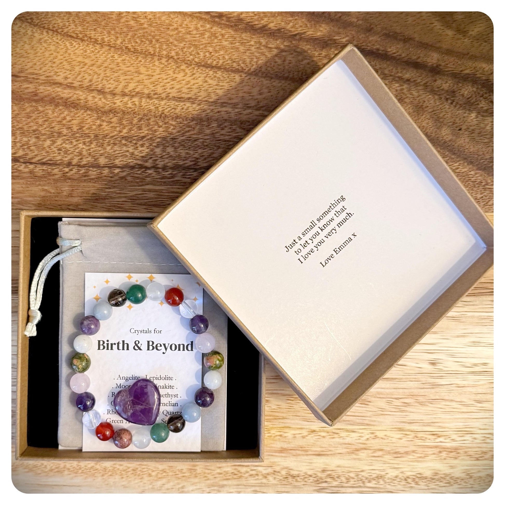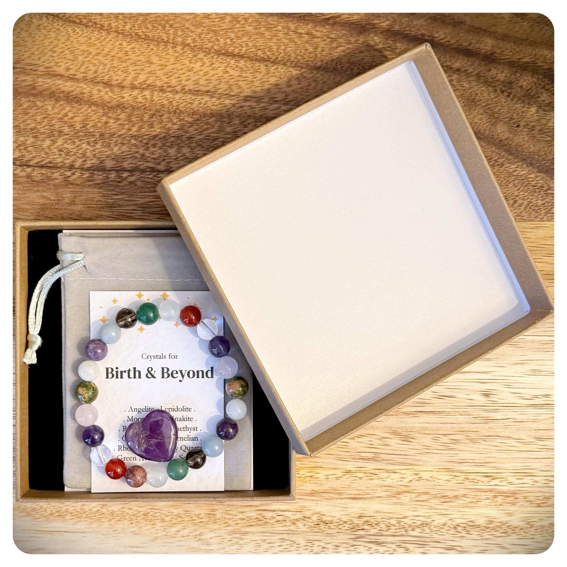 This handmade birth and beyond crystal bracelet is designed to support new mothers through pregnancy, childbirth, and the postpartum journey. Carefully crafted with nurturing and protective crystals, it promotes emotional balance, strength, and healing.