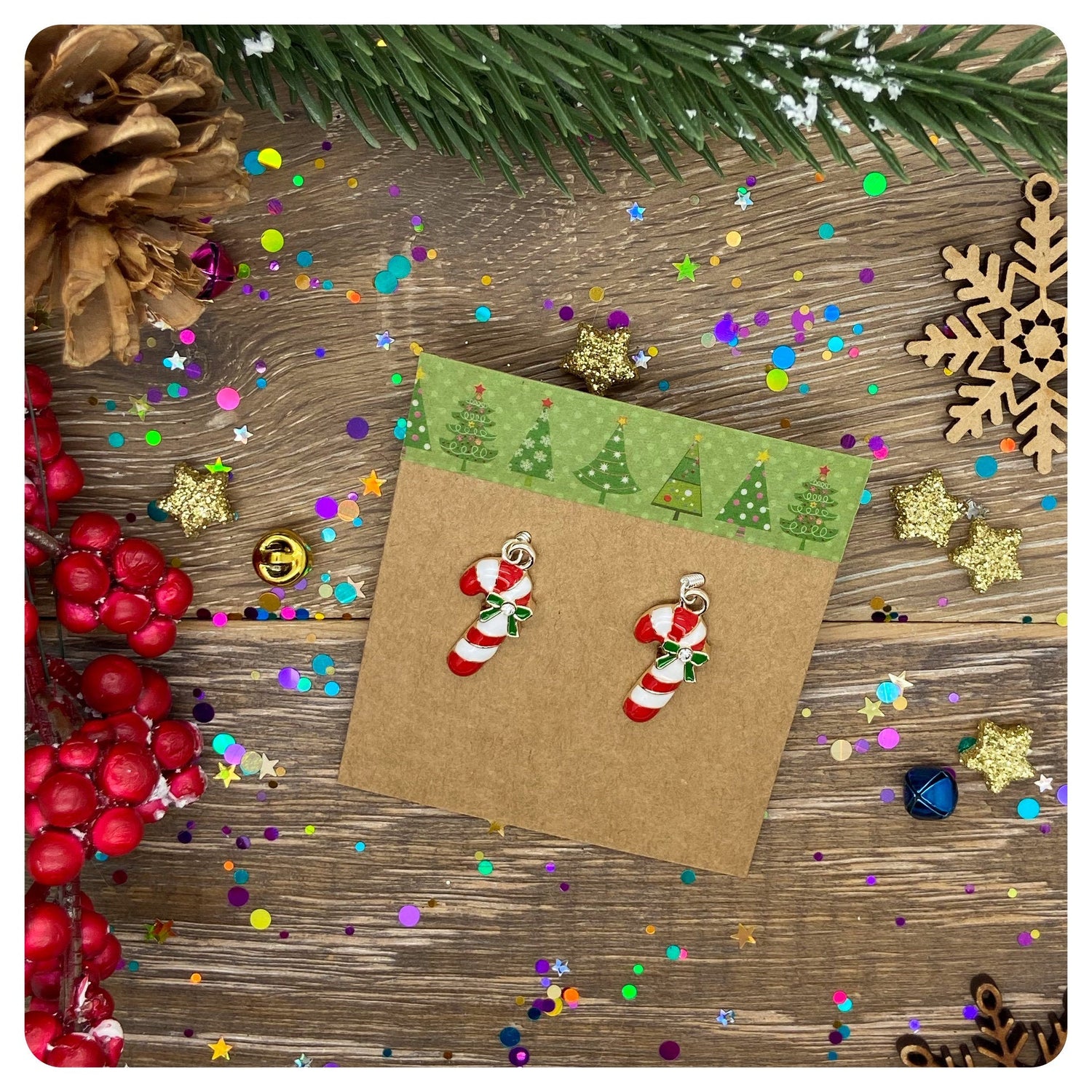 The earrings are displayed on a Christmas themed card and wrapped in a biodegradable cello sleeve for gift giving.