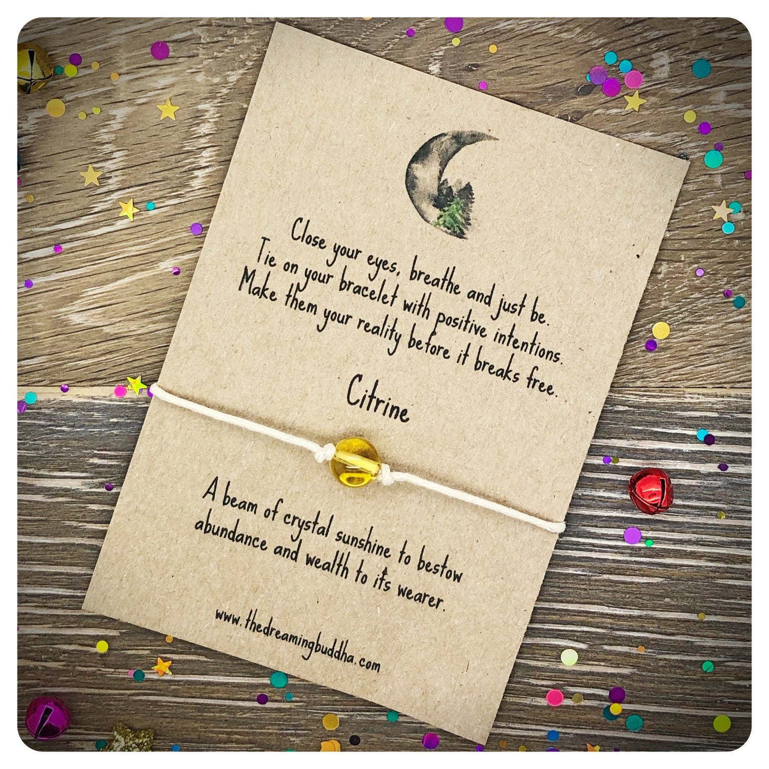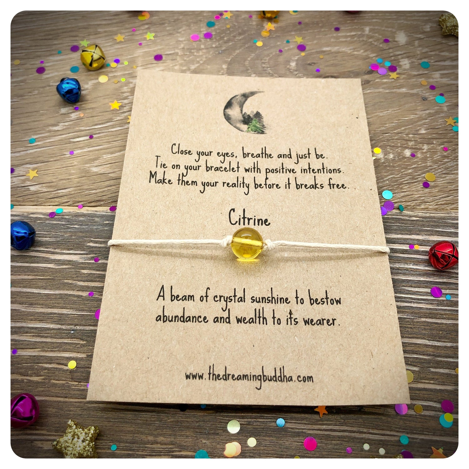 Each bracelet includes a genuine Citrine crystal bead and is made from quality 1mm waxed cord. The bracelet is mounted on recycled card and carefully wrapped in a clear cellophane sleeve. The whole package measures 11.5 cm by 9.5 cm.