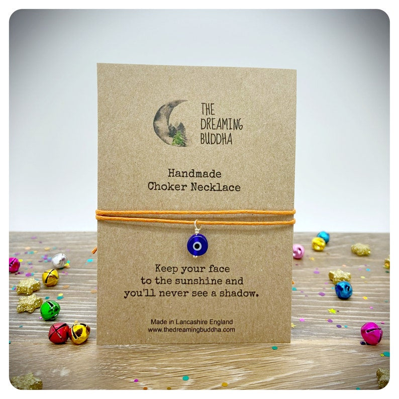 The glass evil eye pendant is threaded on to cotton cord with sliding adjustment knots to each side so the choker size can be adjusted.