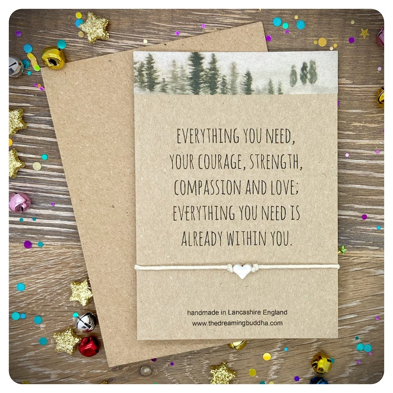 This handmade wish bracelet card reads - Everything you need, your courage, strength, compassion and love, everything you need is already within you.