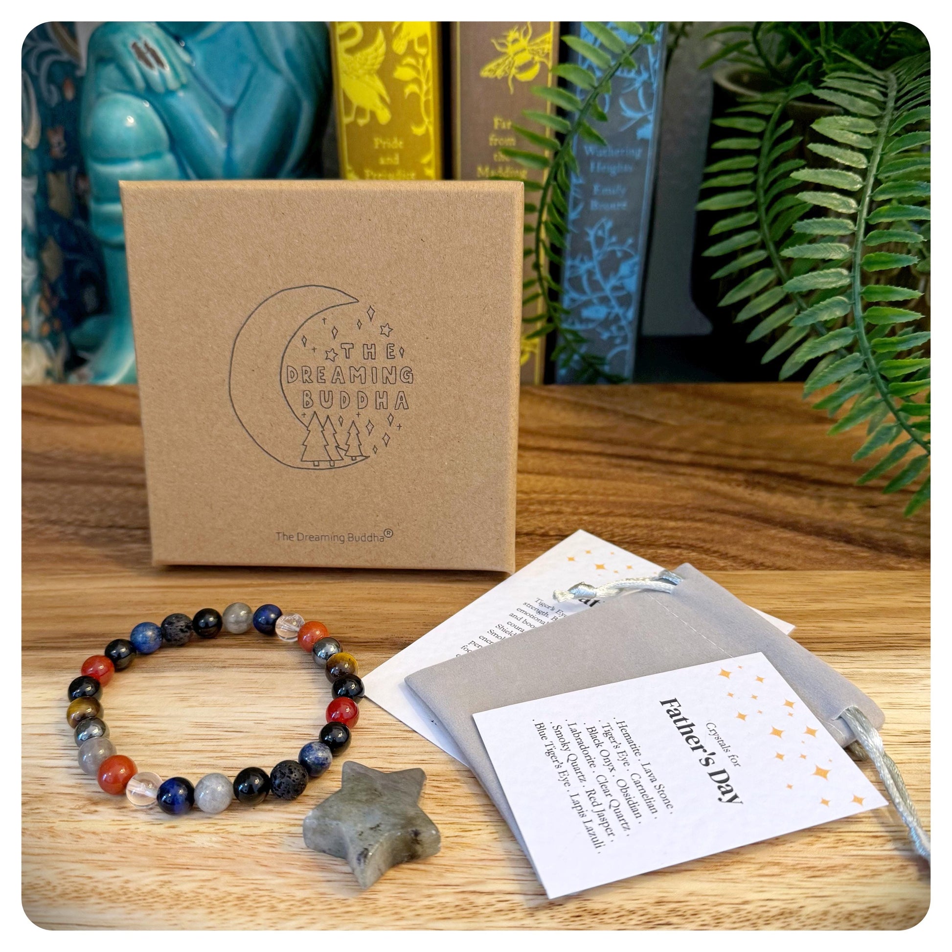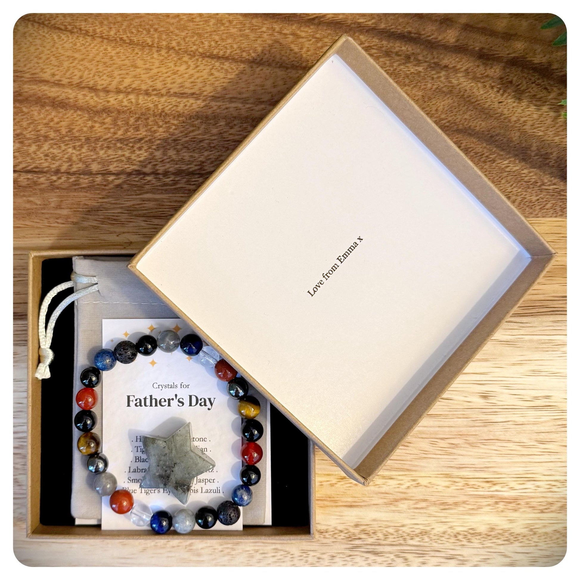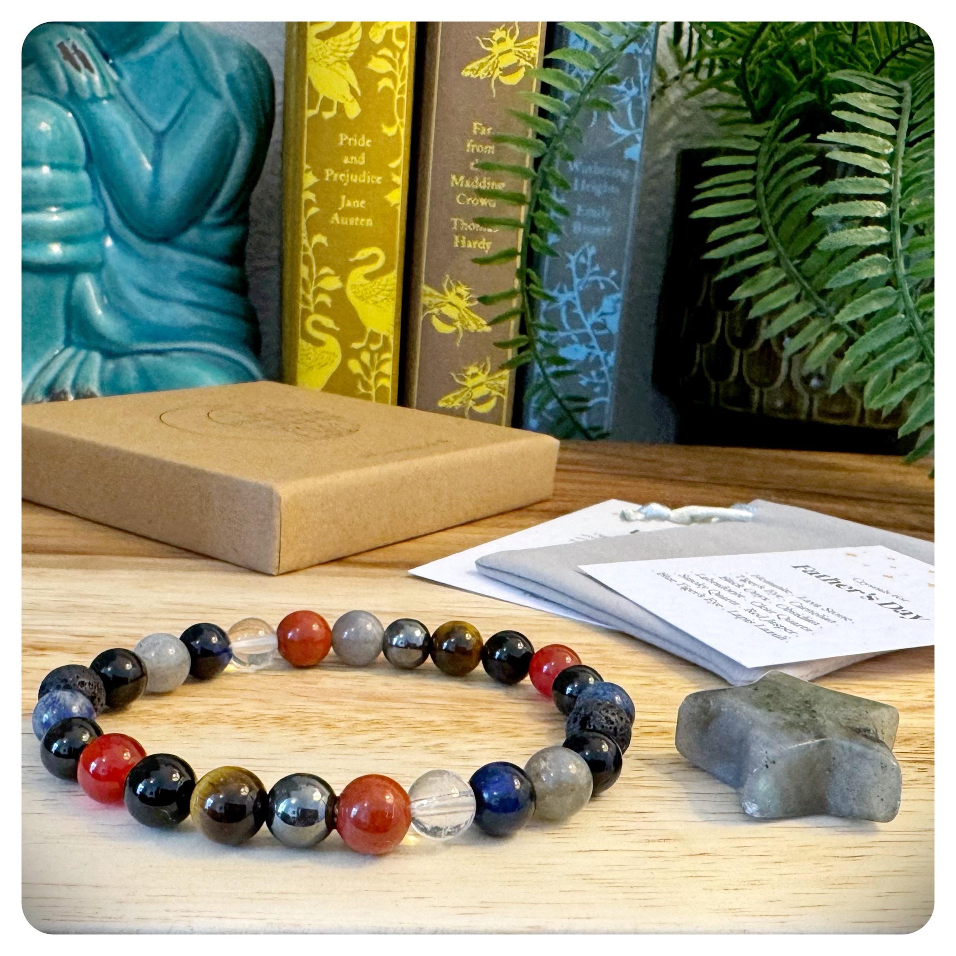 This handmade father's day crystal bracelet is a meaningful gift, designed to honour strength, protection, and wisdom. Featuring a powerful selection of natural crystals, this bracelet promotes confidence, grounding, and positive energy.