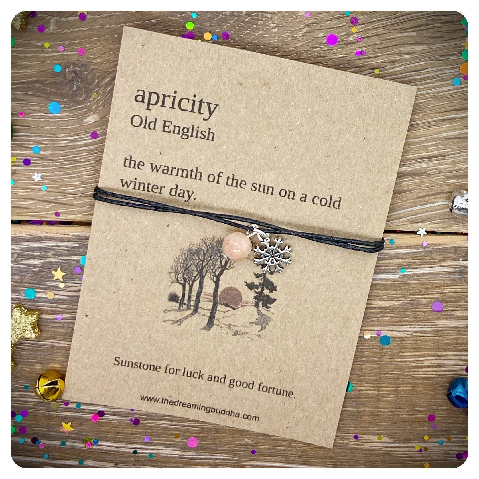 This handmade bracelet card reads - apricity Old English - the warmth of the sun on a cold winters day.