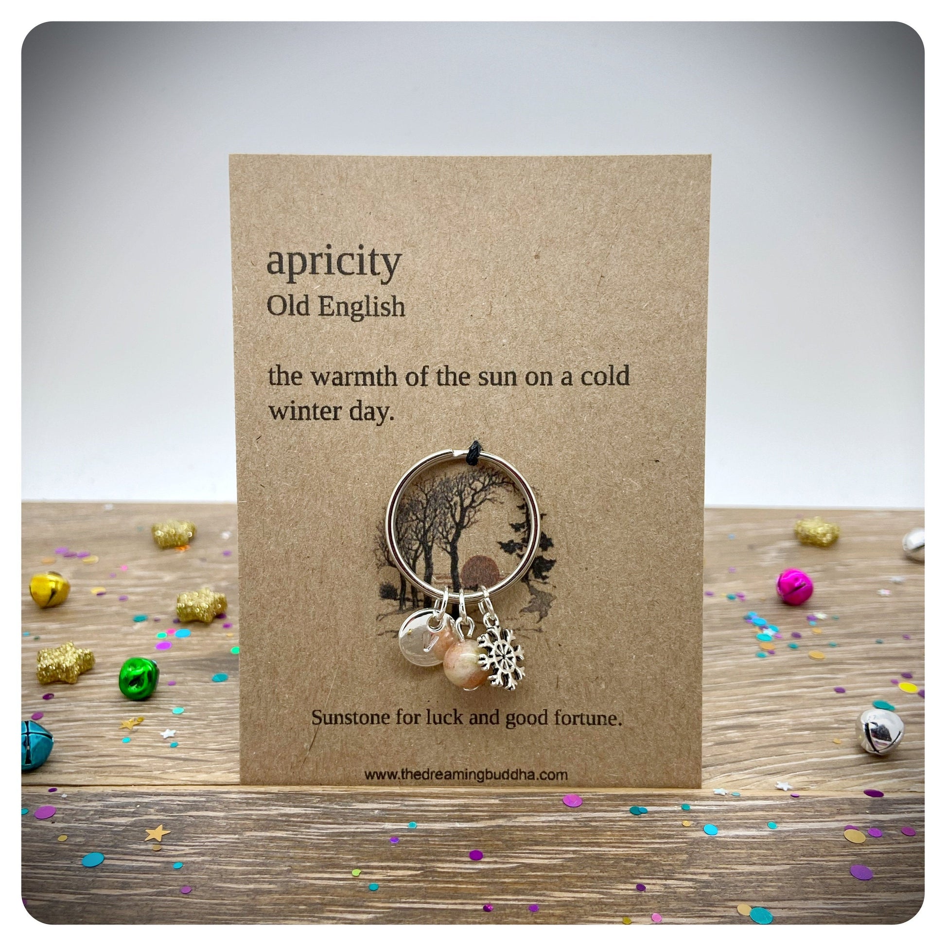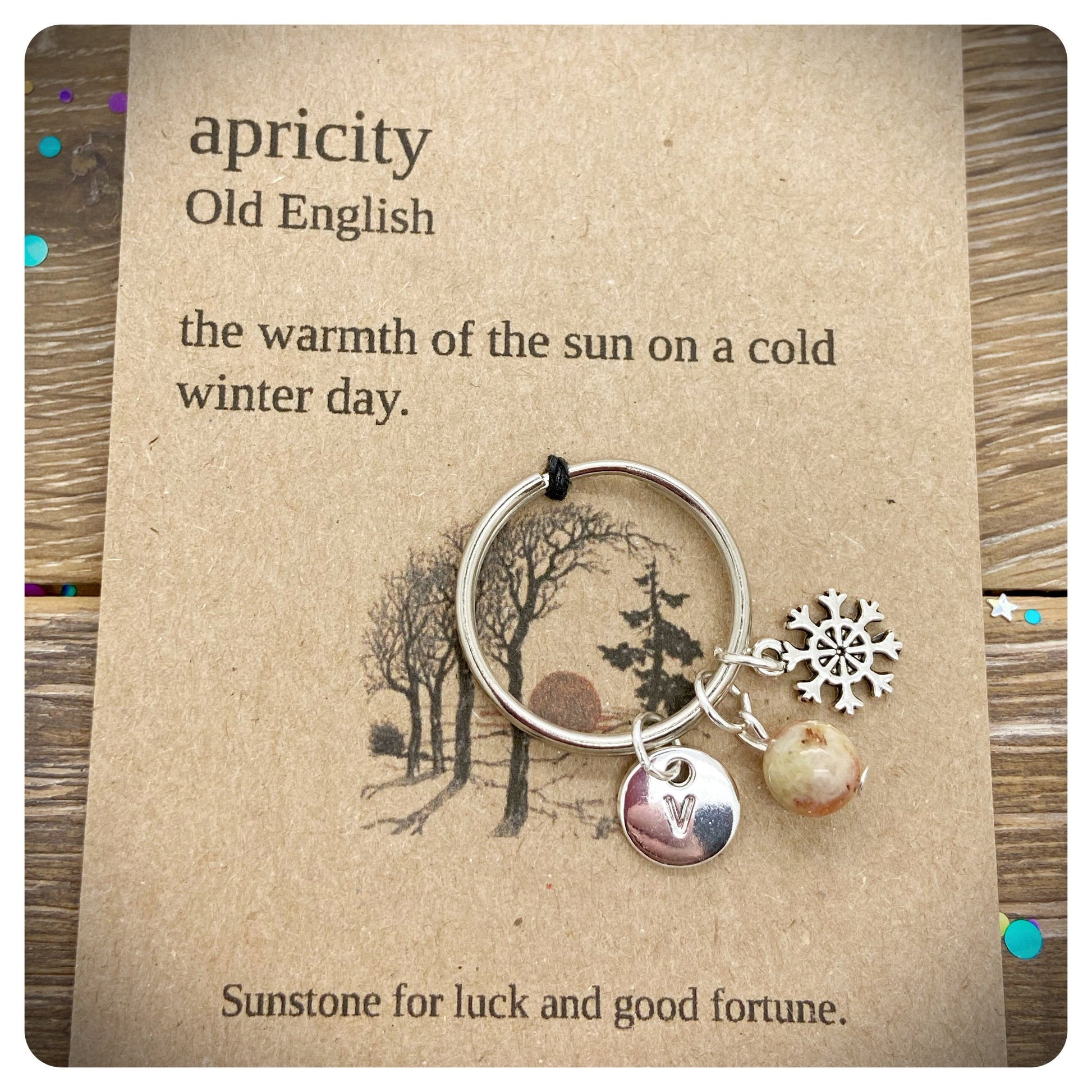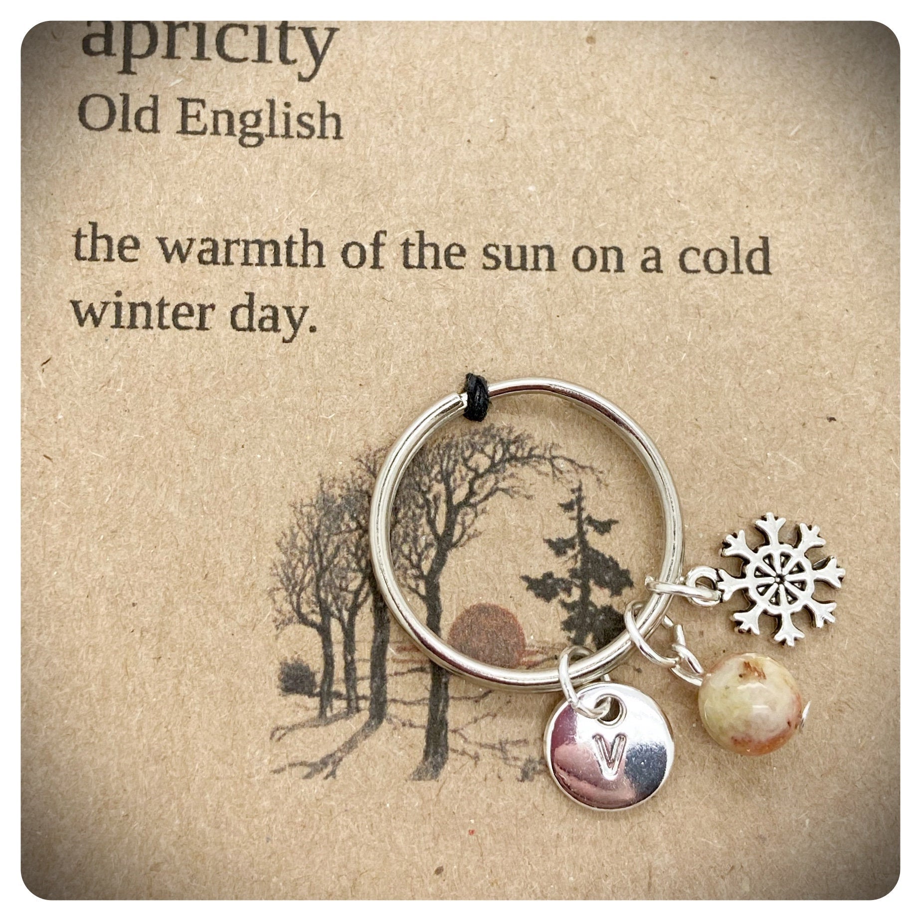 This handmade keyring, sits upon a card that reads - apricity Old English - the warmth of the sun on a cold winters day.
