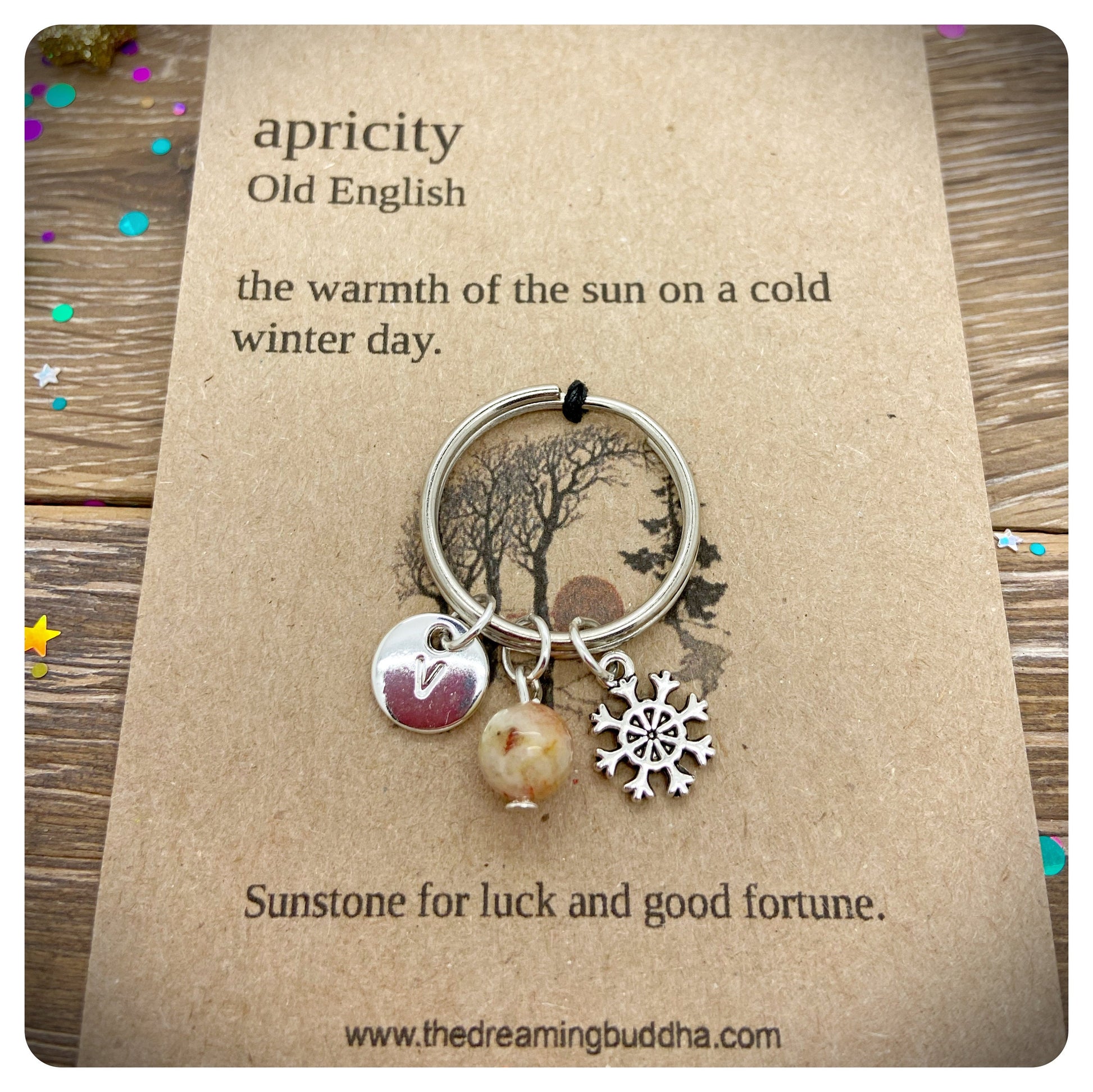 The keyring carries a snowflake charm and sunstone bead. Sunstone is for good luck and good fortune.