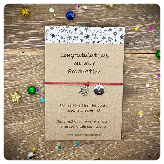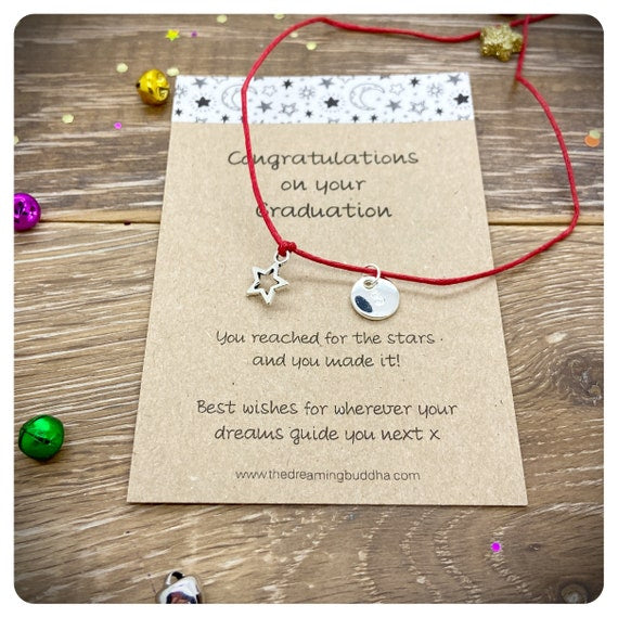 This handmade wish bracelet card reads - Congratulations on your graduation. You reached for the stars and you made it. Best wishes for wherever your dreams guide you next.