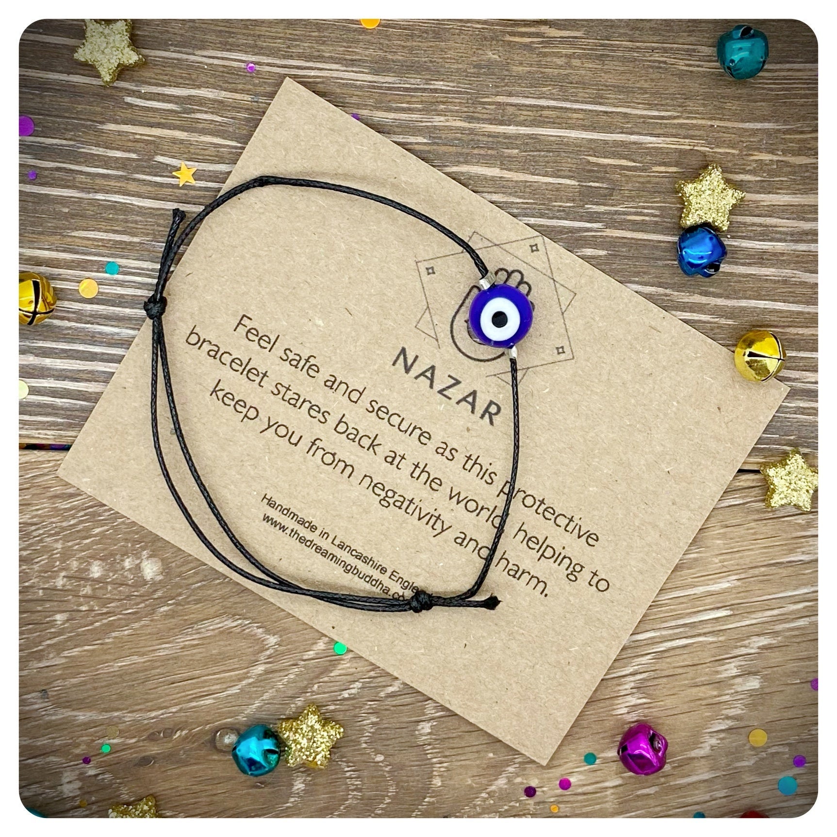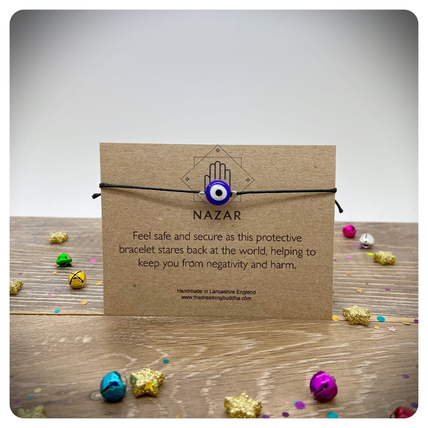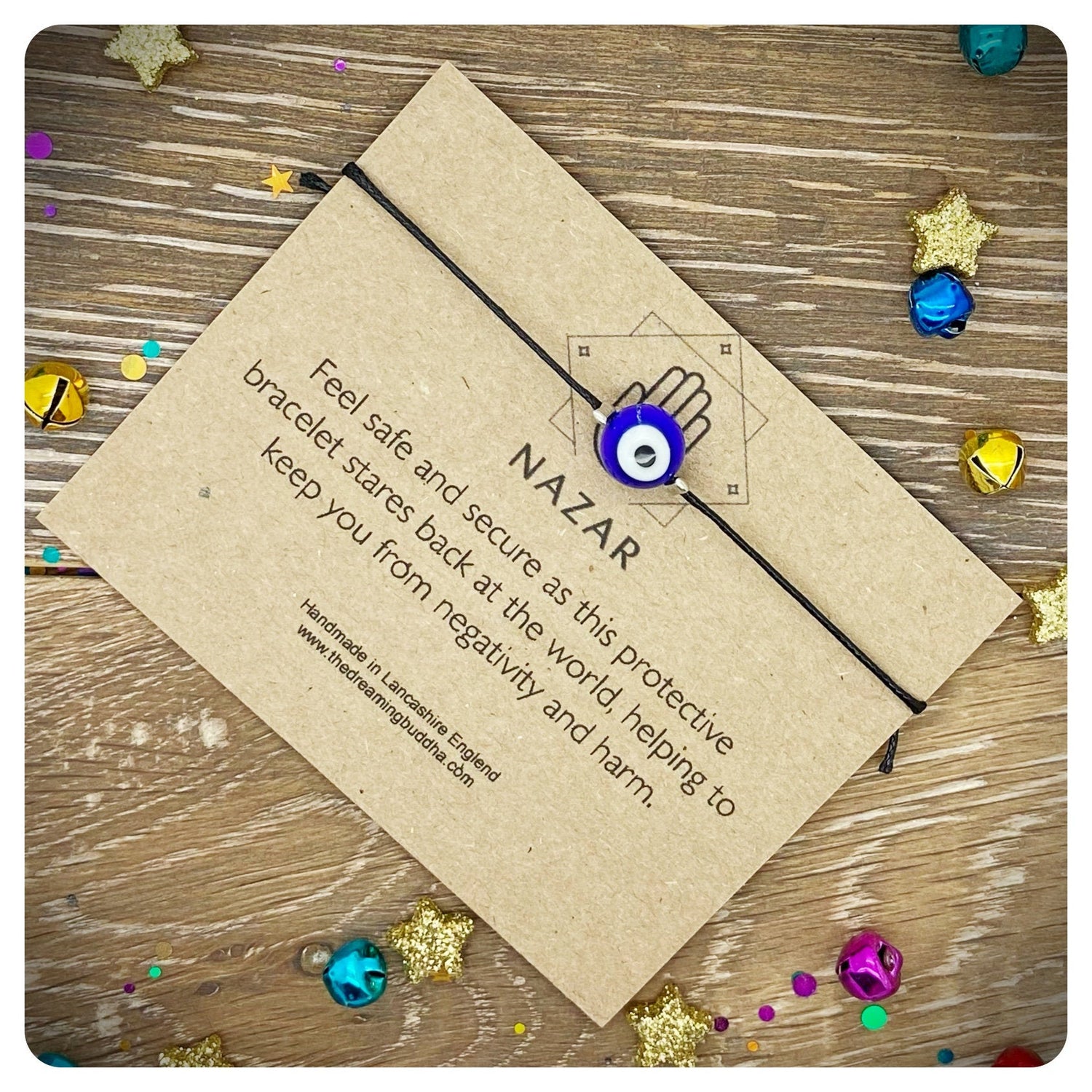 This handmade card reads - Feel safe and secure as this protective bracelet stares back at the world to keep you safe from negativity and harm.