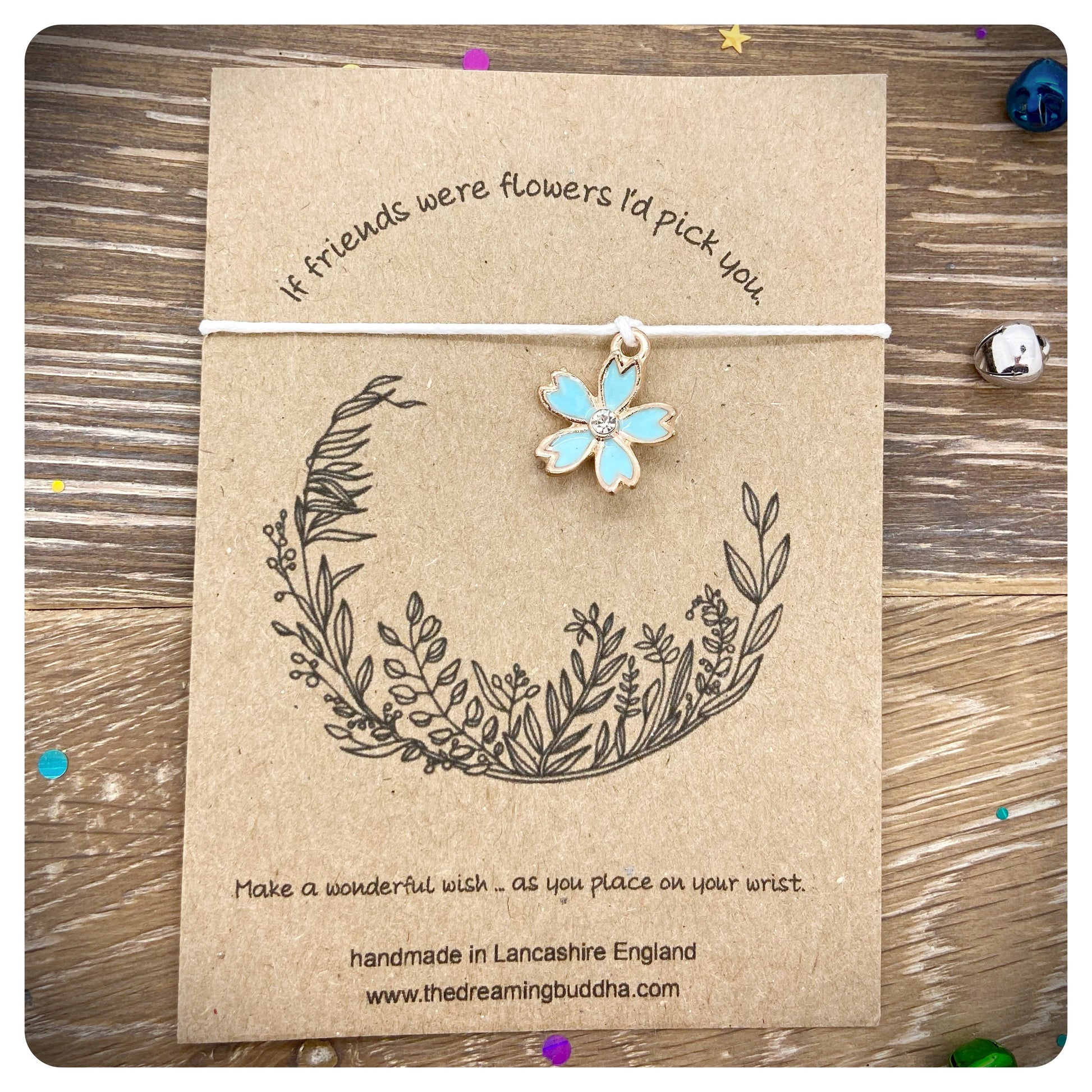 This handmade wish bracelet card reads - If friends were flowers I’d pick you.