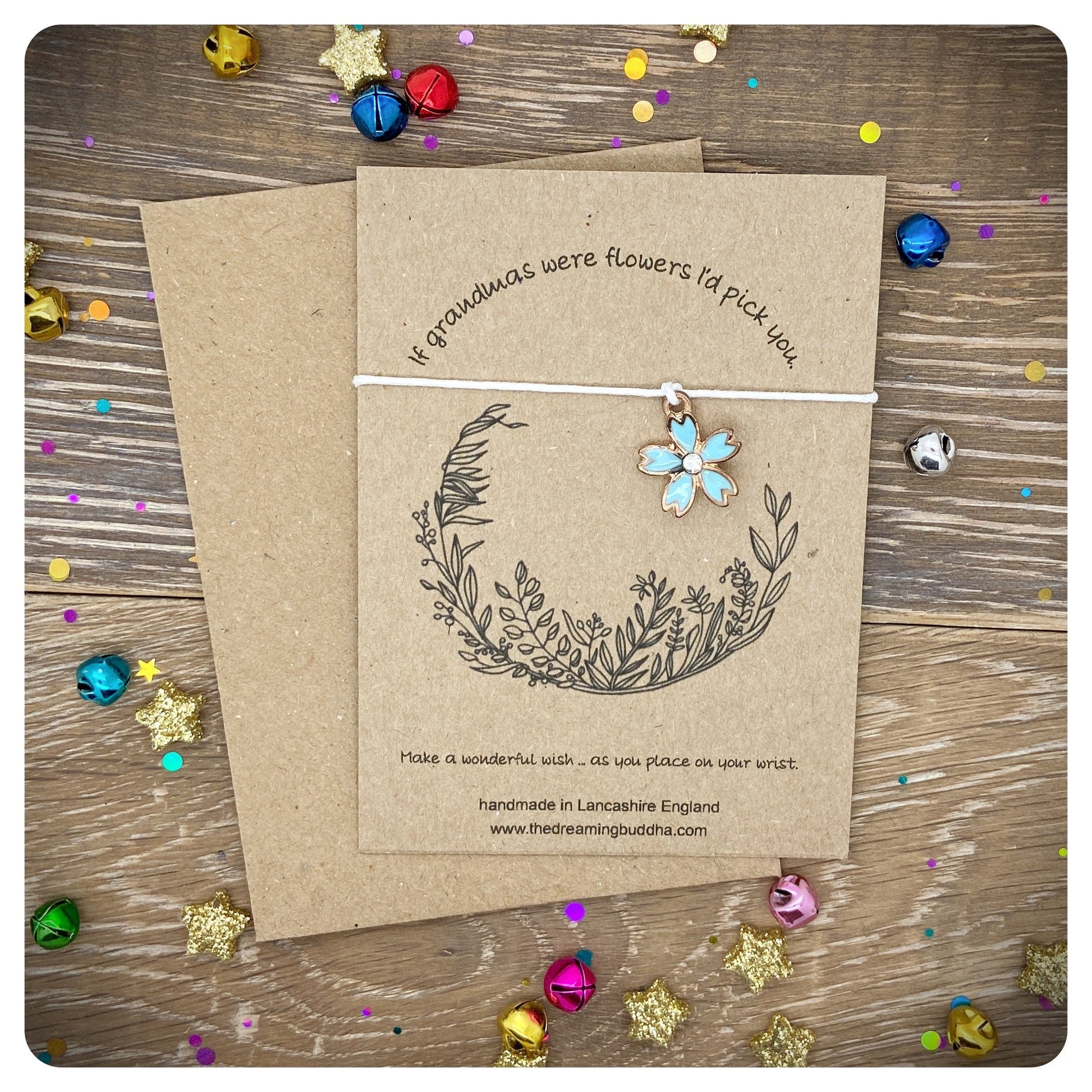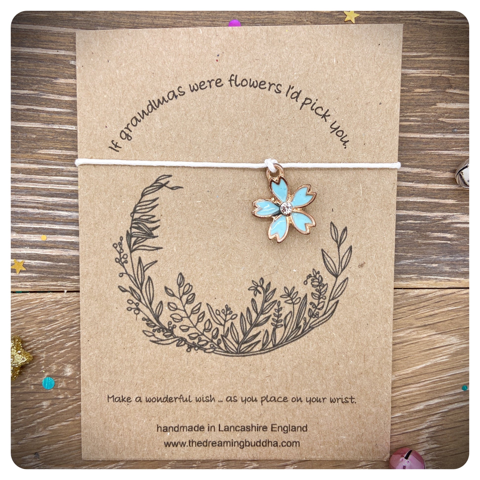 This handmade wish bracelet card reads - If grandmas were flowers I’d pick you.