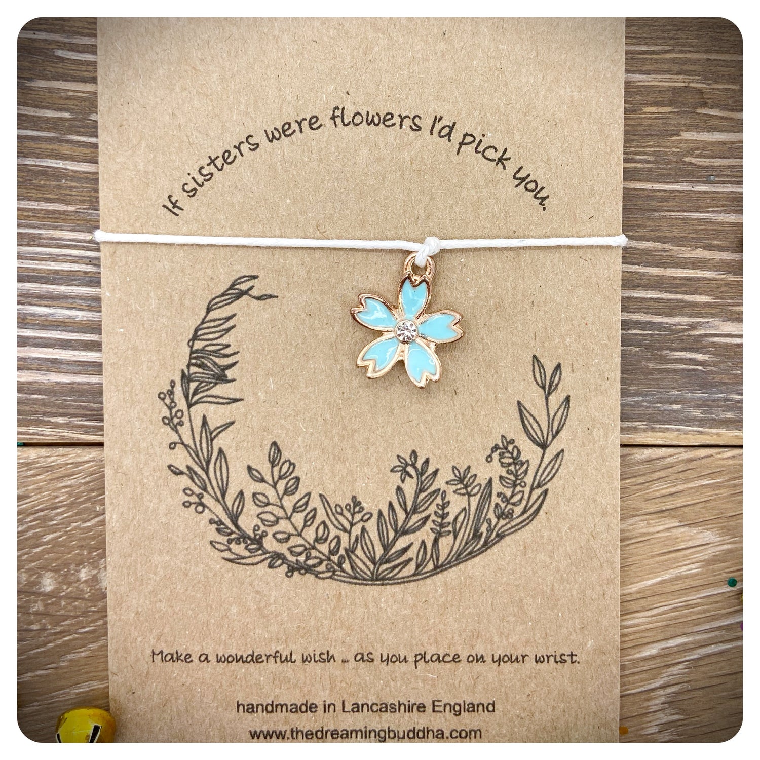 This handmade wish bracelet card reads - If sisters were flowers I’d pick you.