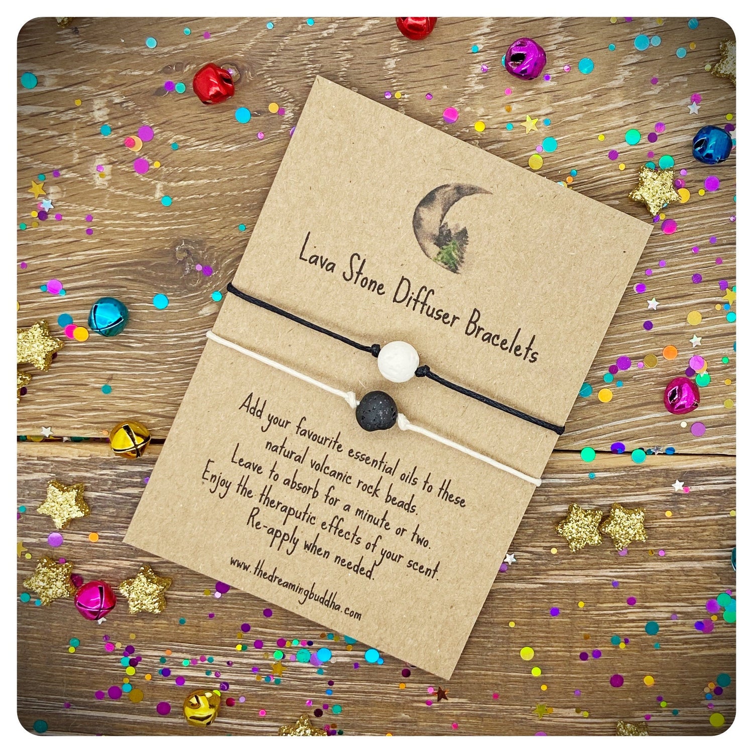Each bracelet includes a volcanic rock lava bead and waxed cord to be tied on your wrist.