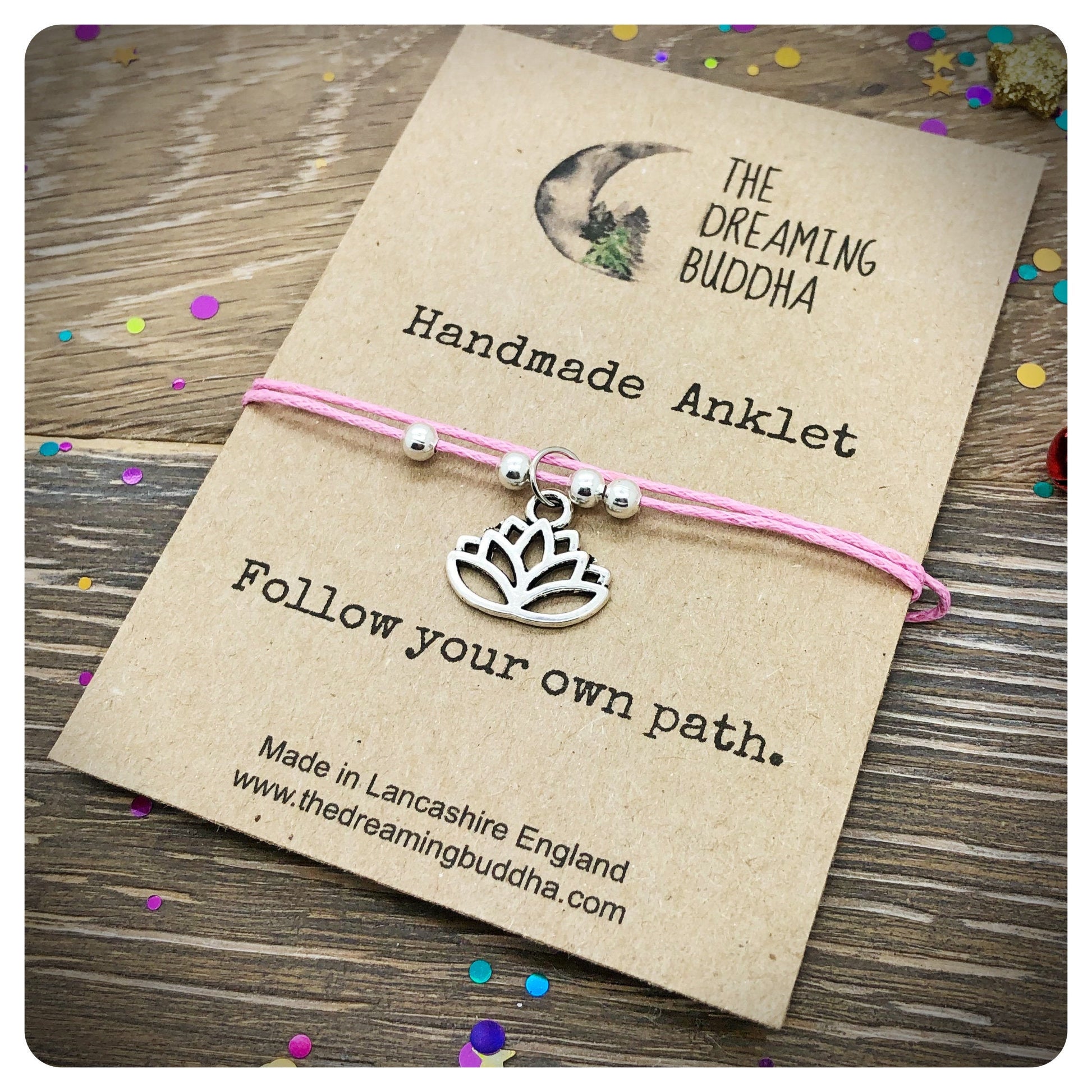 Beaded Lotus Charm Anklet, Silver Lotus Flower Anklet, Yoga Jewellery, Adjustable Cord Anklet, Summer Festival Wear, Yoga Accessory