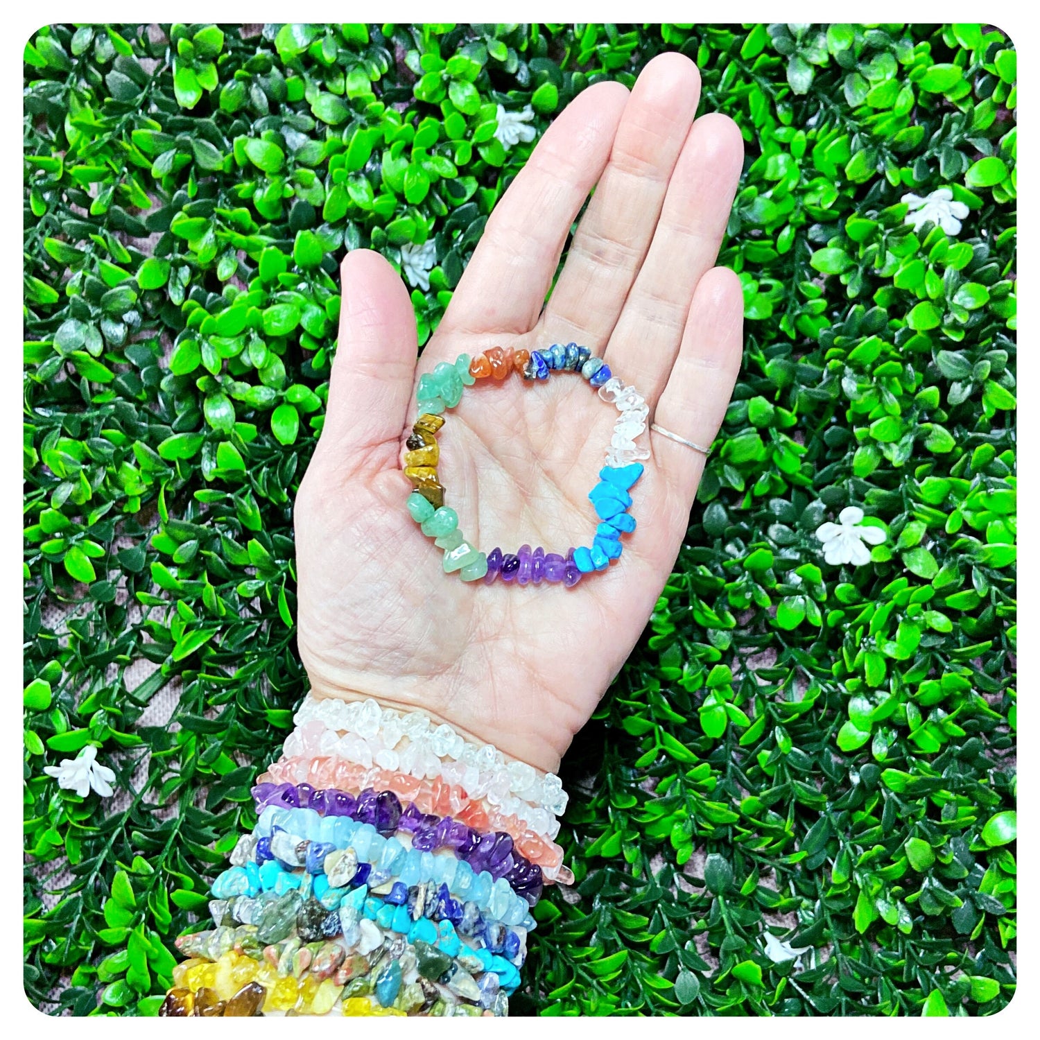 These bracelets are made with small, tumbled chips of different crystals, each with its own unique properties.