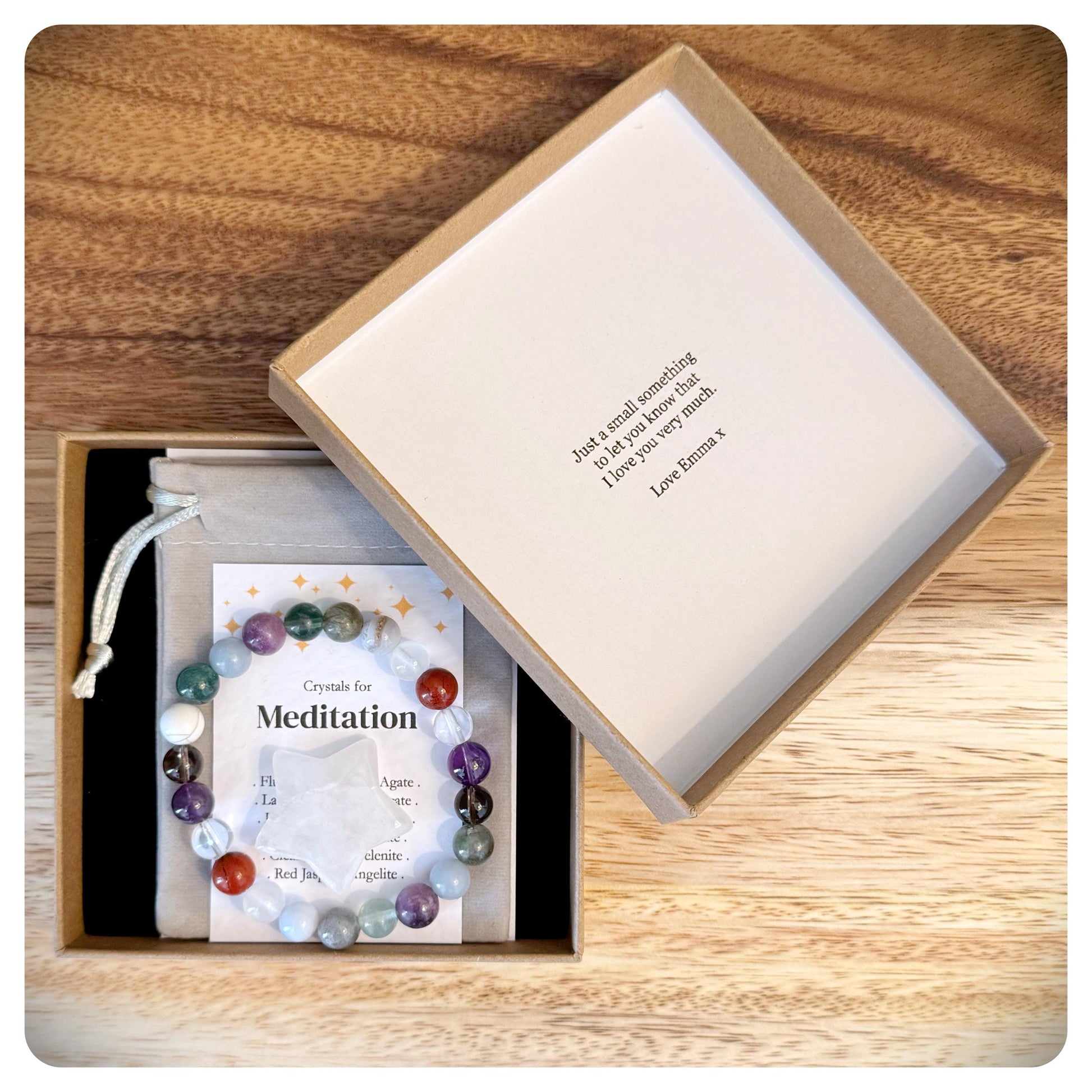 * Packaging: Gift box that can be personalised, crystal star, informational cards and soft storage pouch included.