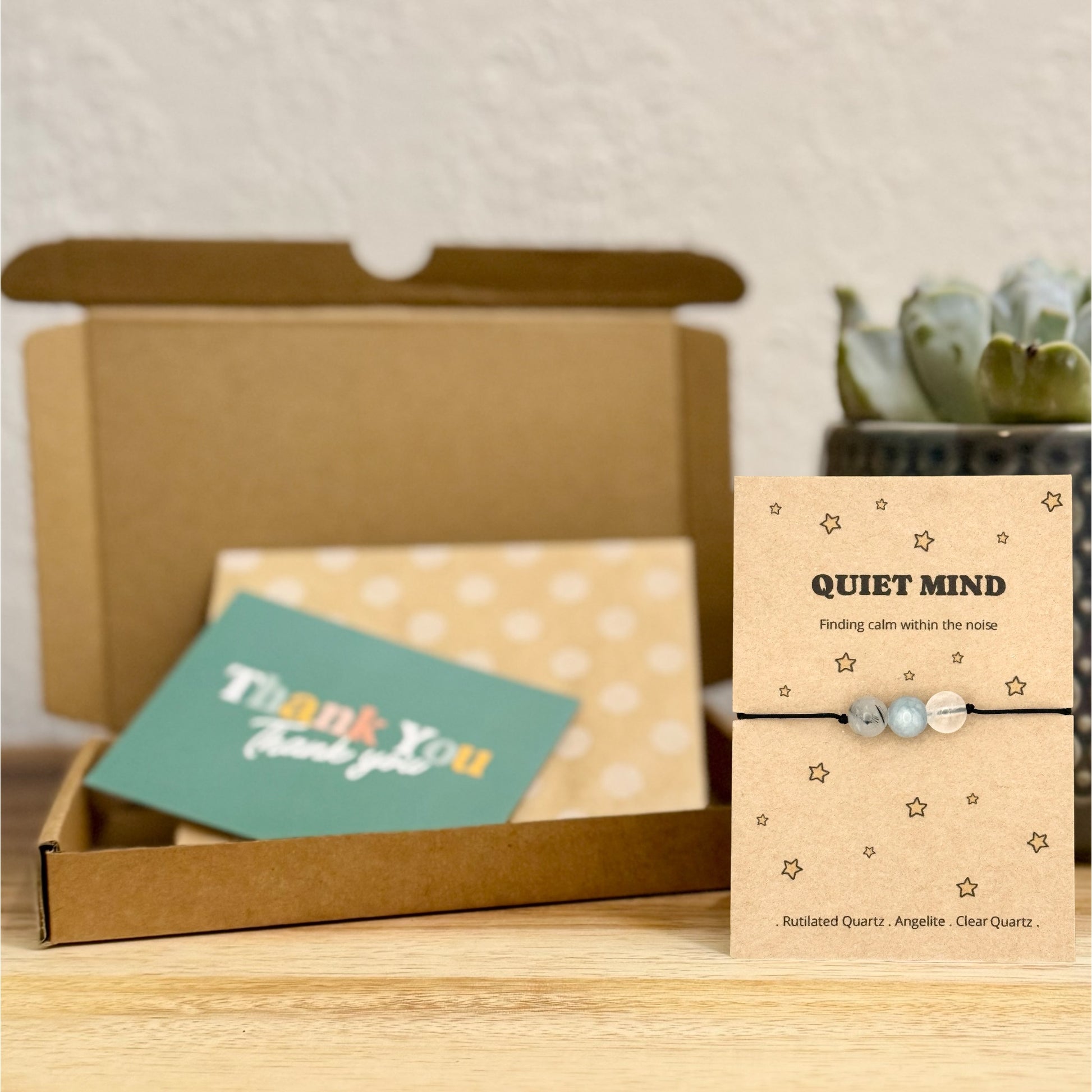 Created with care, this Quiet Mind keepsake features Rutilated Quartz, Angelite and Clear Quartz.
