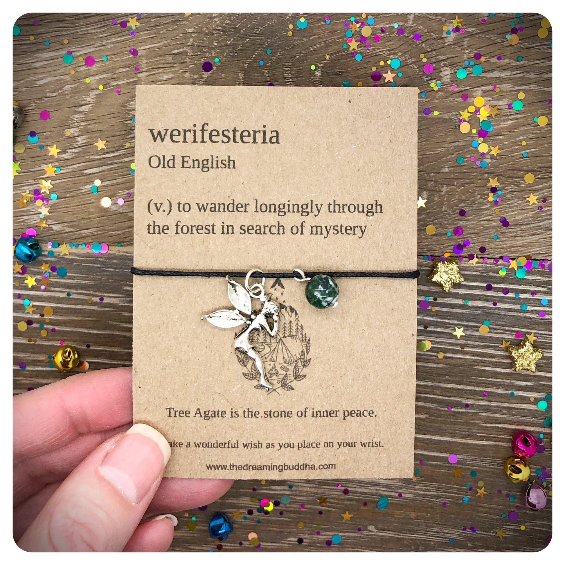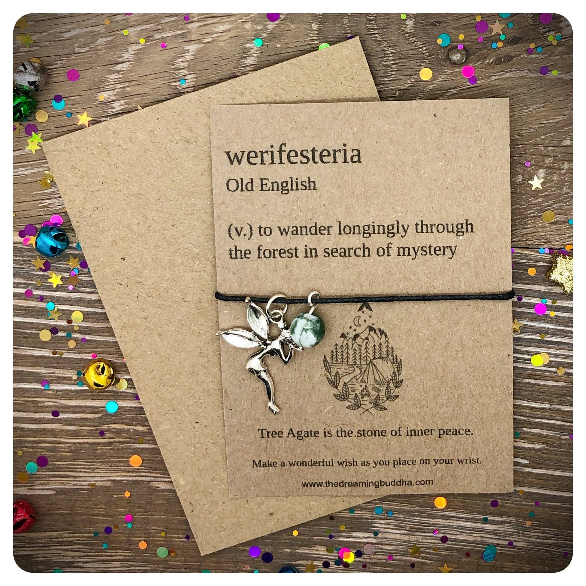 This handmade bracelet card card reads - Werifesteria Old English (v.) to wander longingly through the forest in search of mystery.