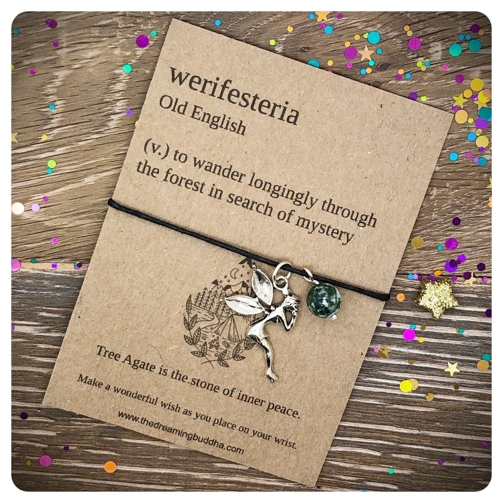 Each bracelet includes a fairy charm and tree agate bead and is made with quality black cotton cord with adjustment knots.