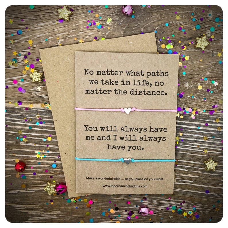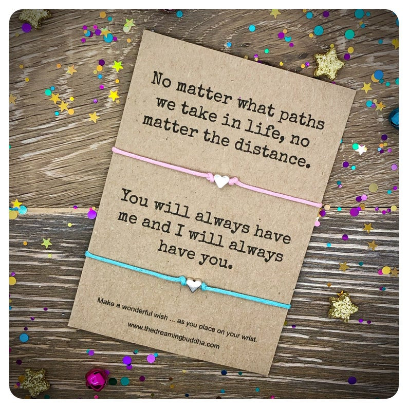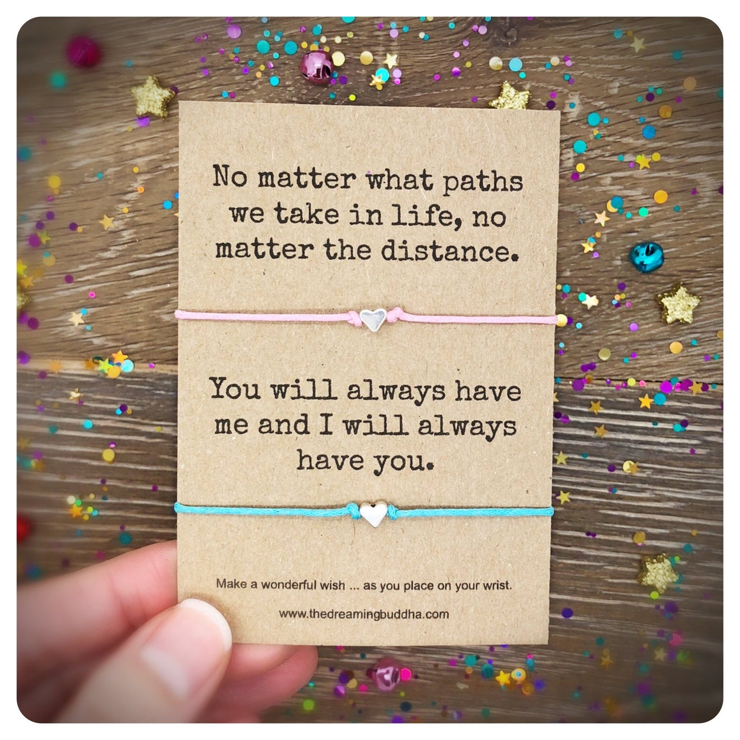 This handmade wish bracelet card reads - No matter what paths we take in life, no matter the distance. You will always have me and I will always have you.
