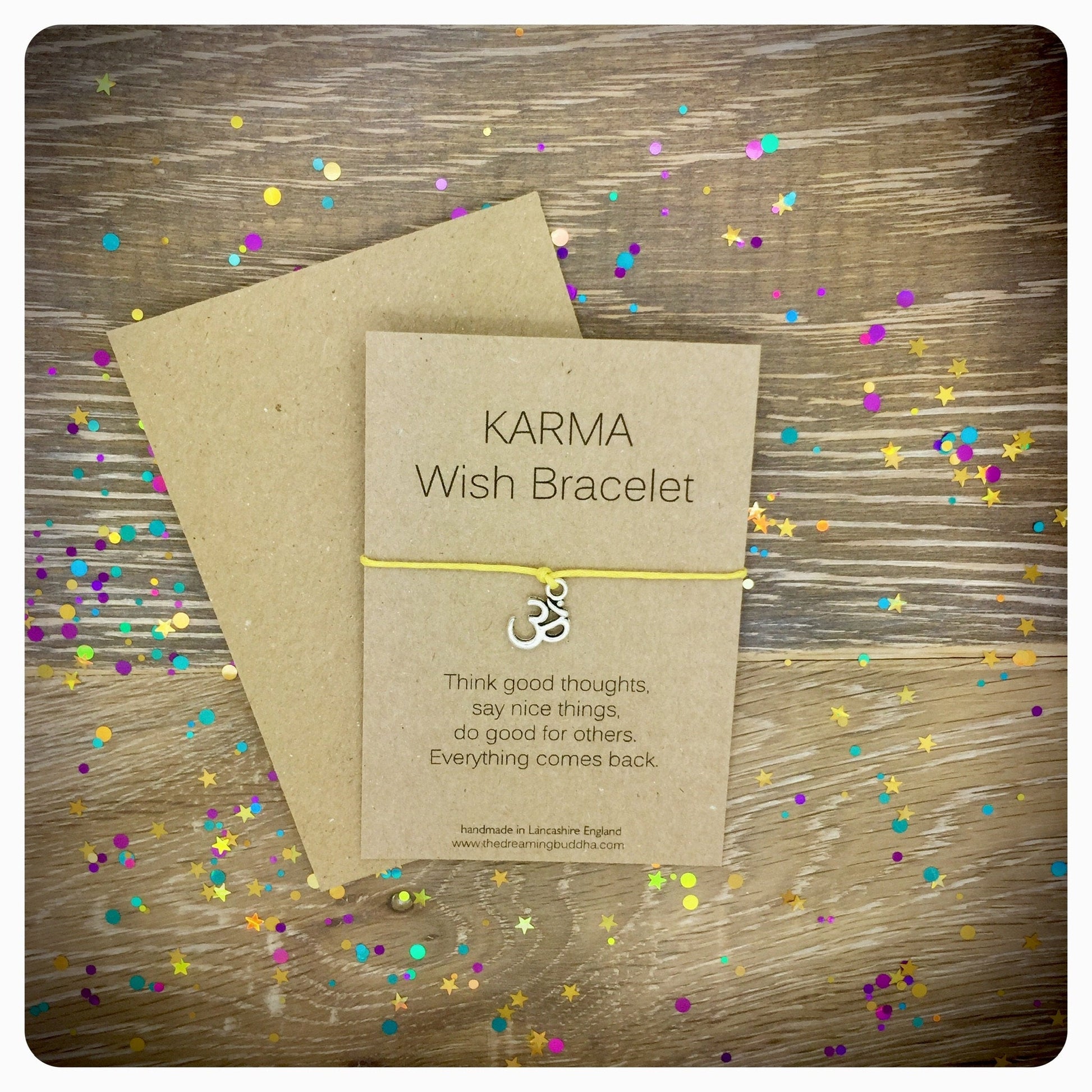 This handmade wish bracelet card reads - Karma - Think good thoughts, say nice things, do good for others, everything comes back.