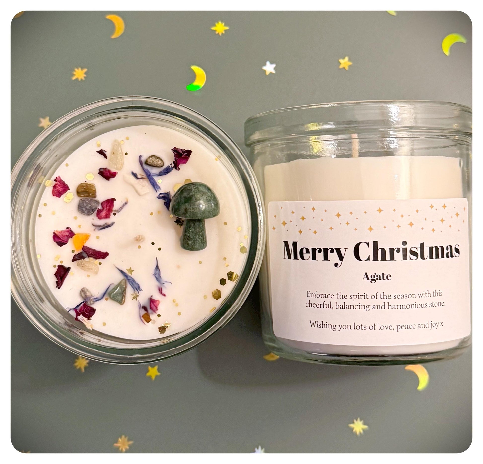 Personalised Christmas Crystal Candle Natural Crystal Mushroom Gift, Gemstone Candle Gift For Mum Friend Festive Home Decor Present