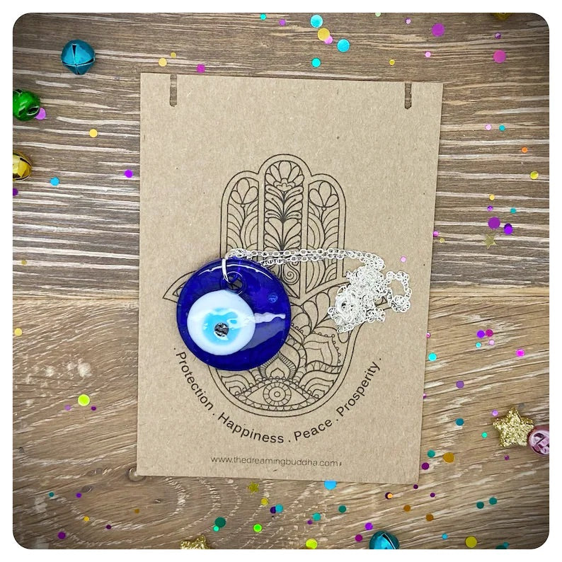 This glass Evil eye pendant necklace is the perfect accessory for anyone needing a little protection in life.