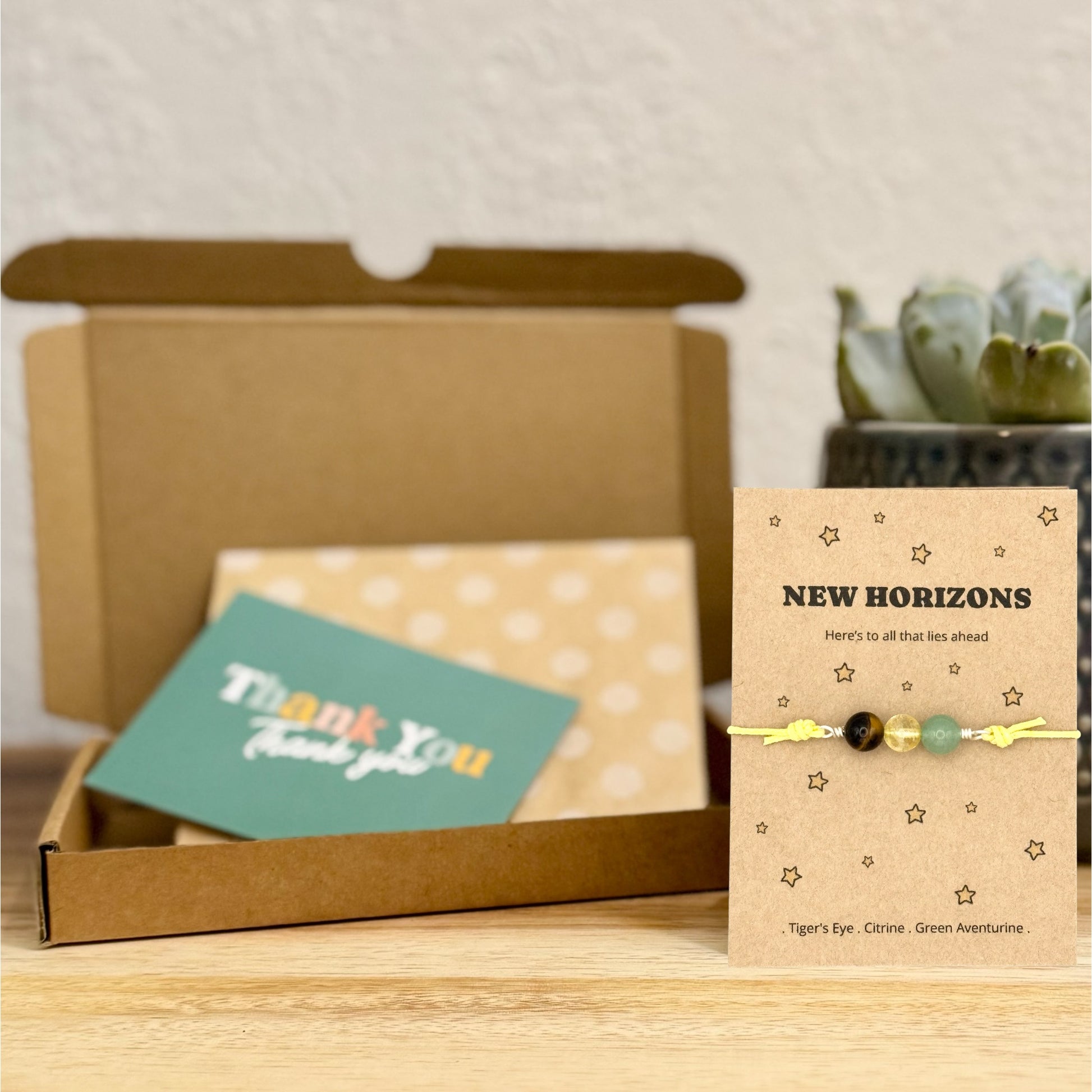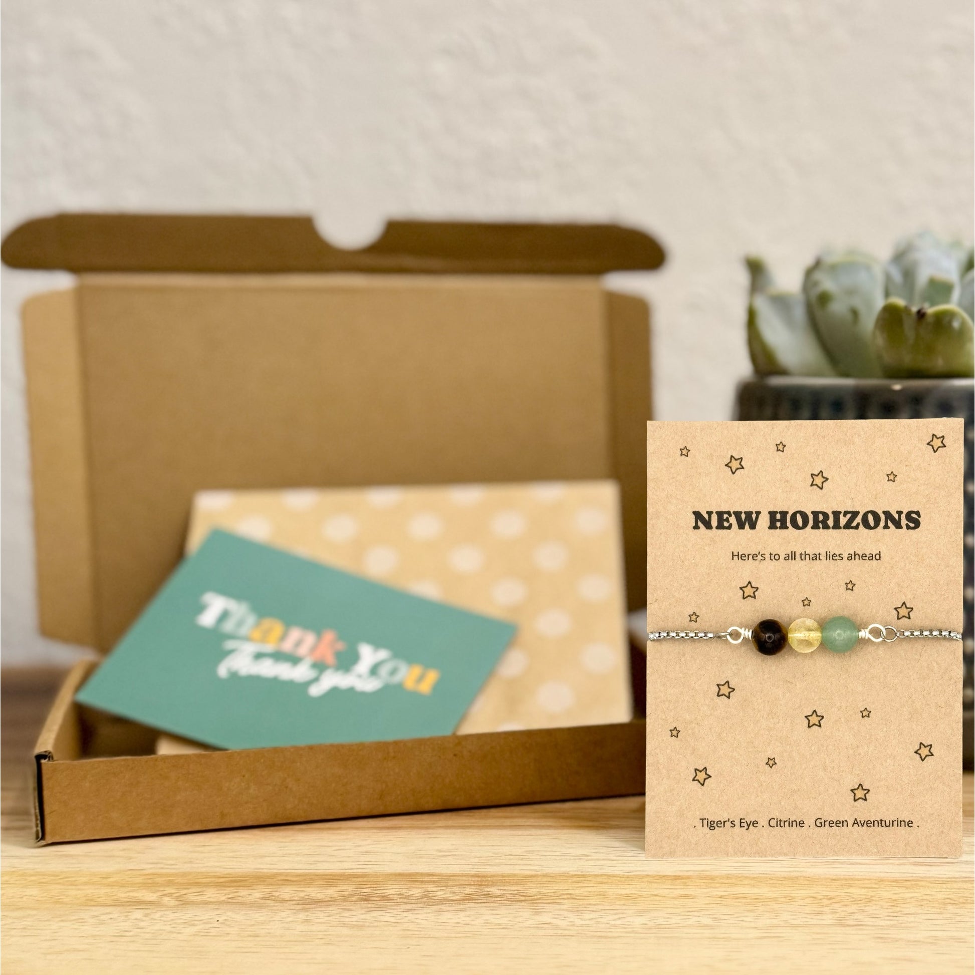 Created with care, this NEW HORIZONS keepsake features Tiger’s Eye, Citrine and Green Aventurine.