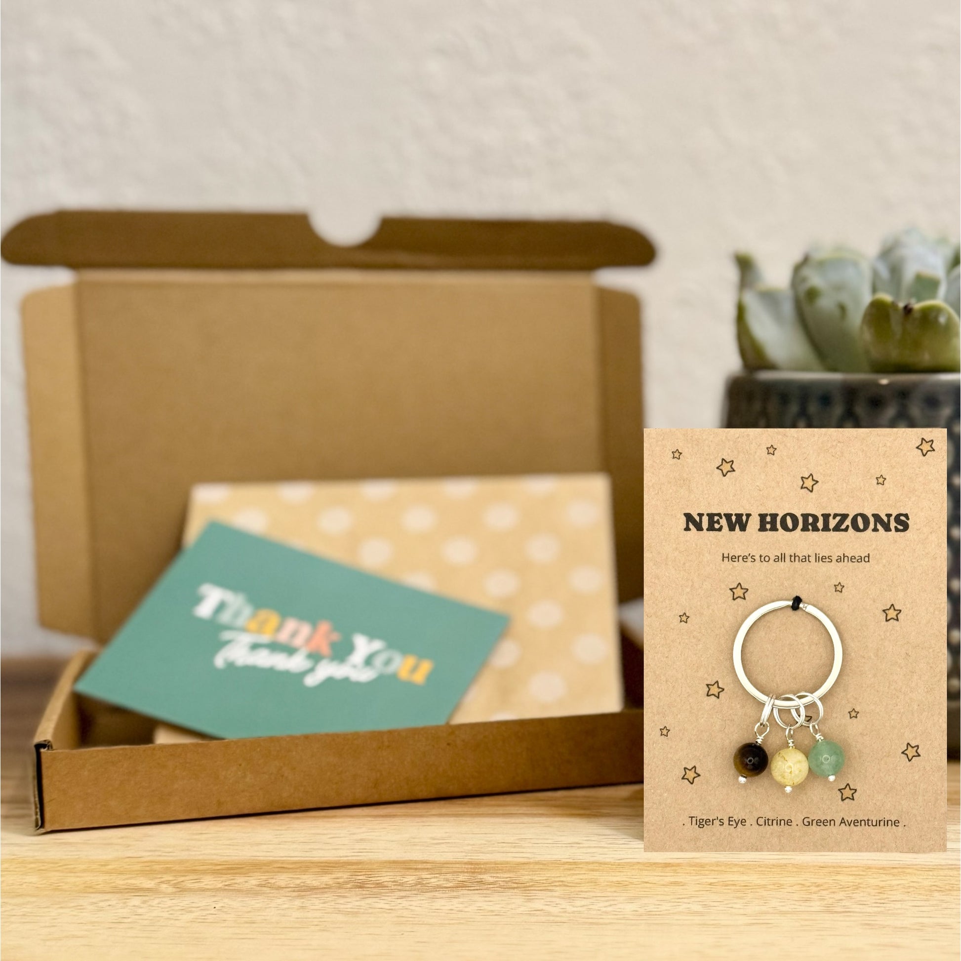 Created with care, this NEW HORIZONS keepsake features Tiger’s Eye, Citrine and Green Aventurine.