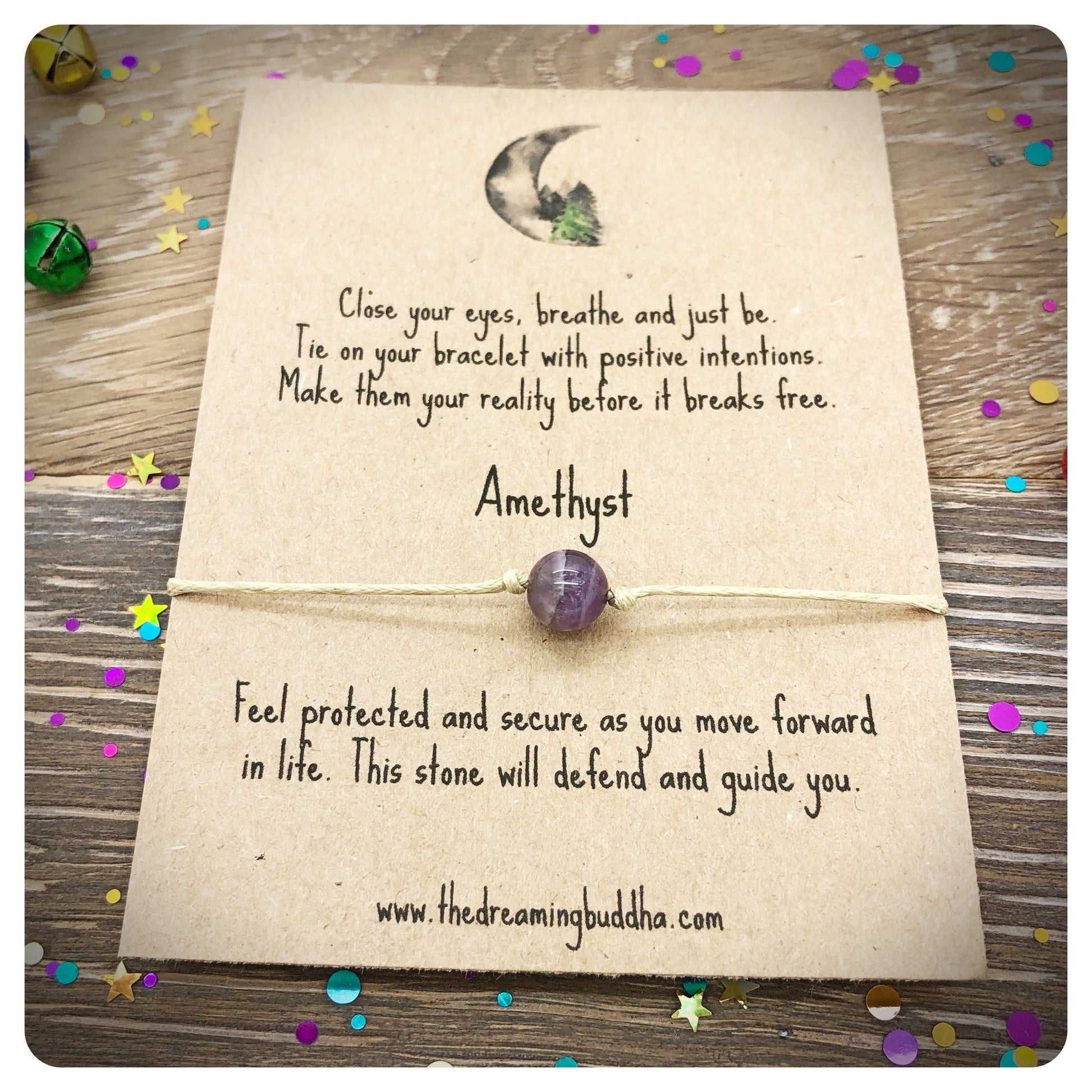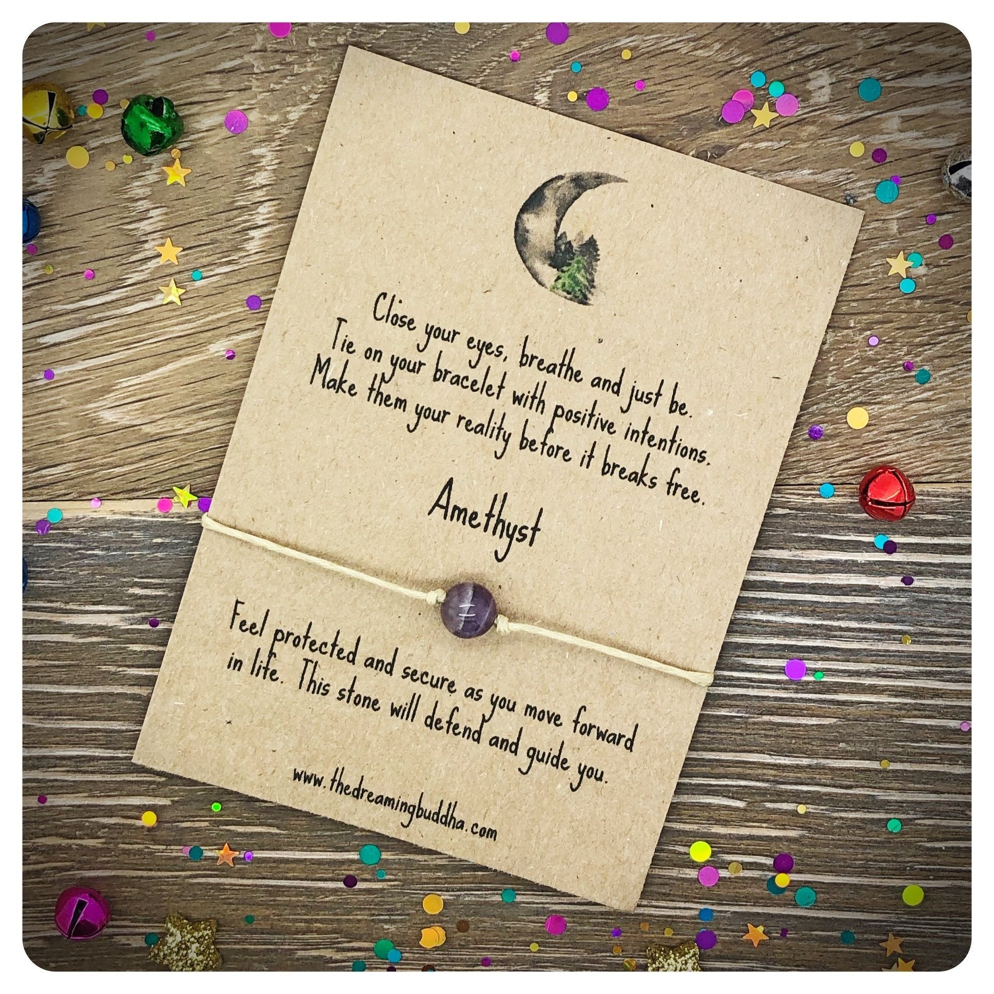 Each bracelet includes a genuine Amethyst crystal bead and is made from quality 1mm waxed cord. The bracelet is mounted on recycled card and carefully wrapped in a clear cellophane sleeve. The whole package measures 11.5 cm by 9.5 cm.