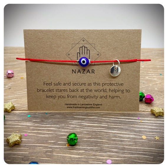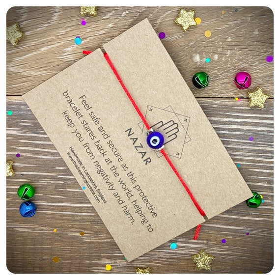 This handmade card reads - Feel safe and secure as this protective bracelet stares back at the world to keep you safe from negativity and harm.
