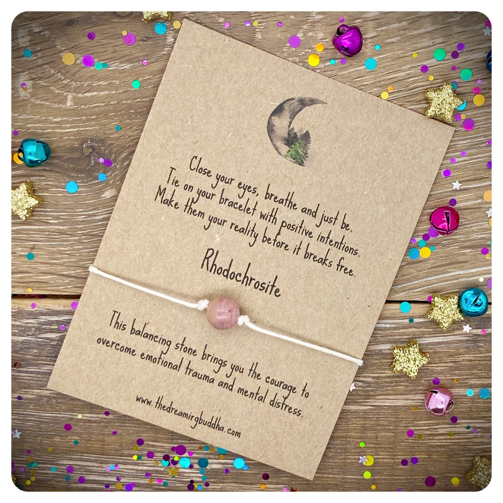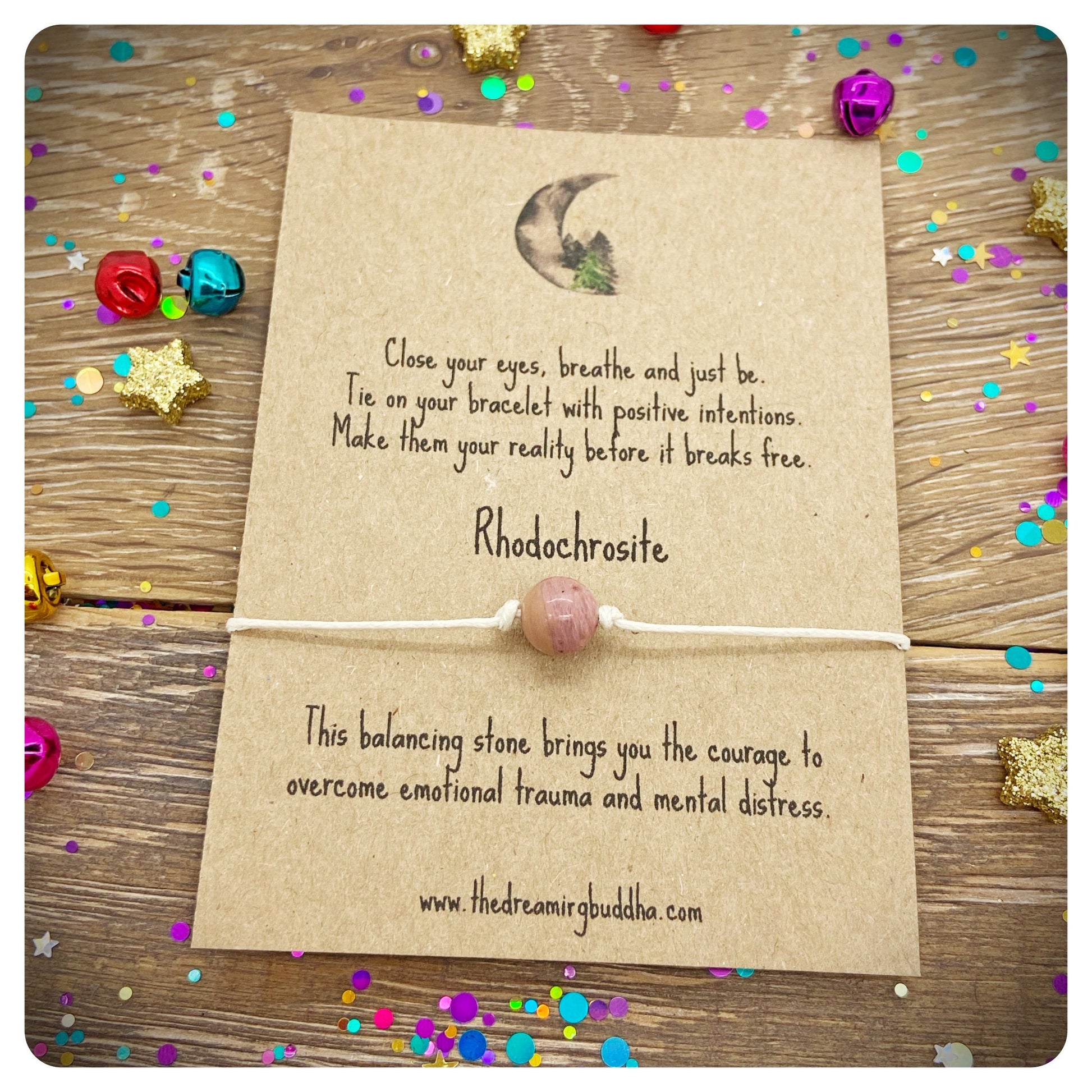 Each bracelet includes a genuine Rhodochrosite crystal bead and is made from quality 1mm waxed cord.