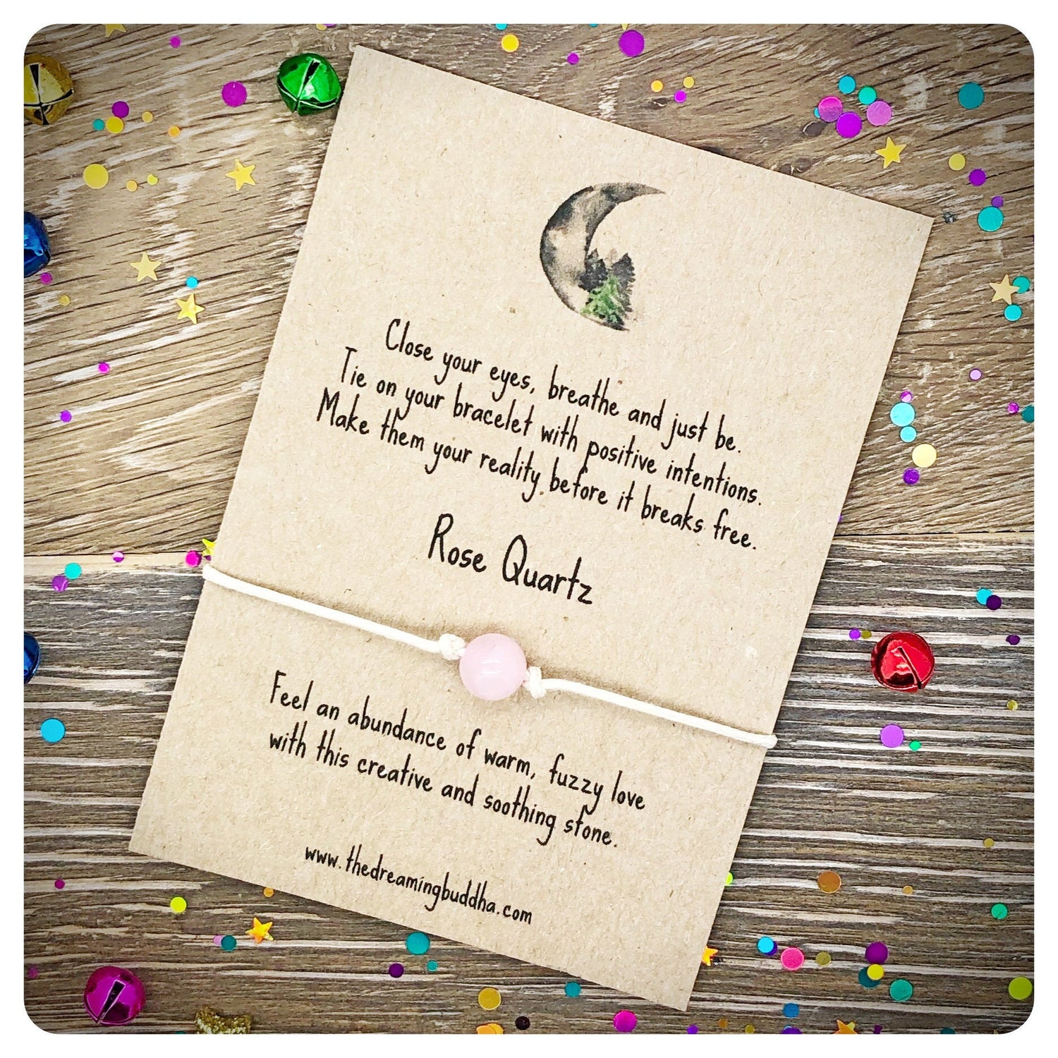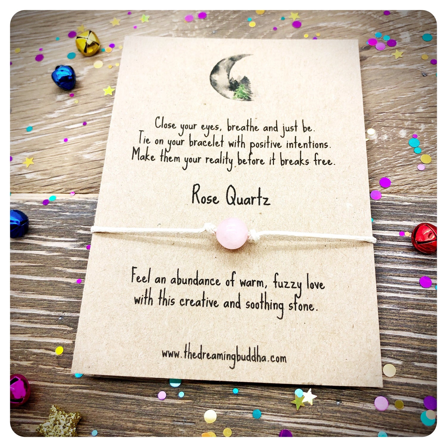 Each bracelet includes a genuine Rose Quartz crystal bead and is made from quality 1mm waxed cord. The bracelet is mounted on recycled card and carefully wrapped in a clear cellophane sleeve. The whole package measures 11.5 cm by 9.5 cm.