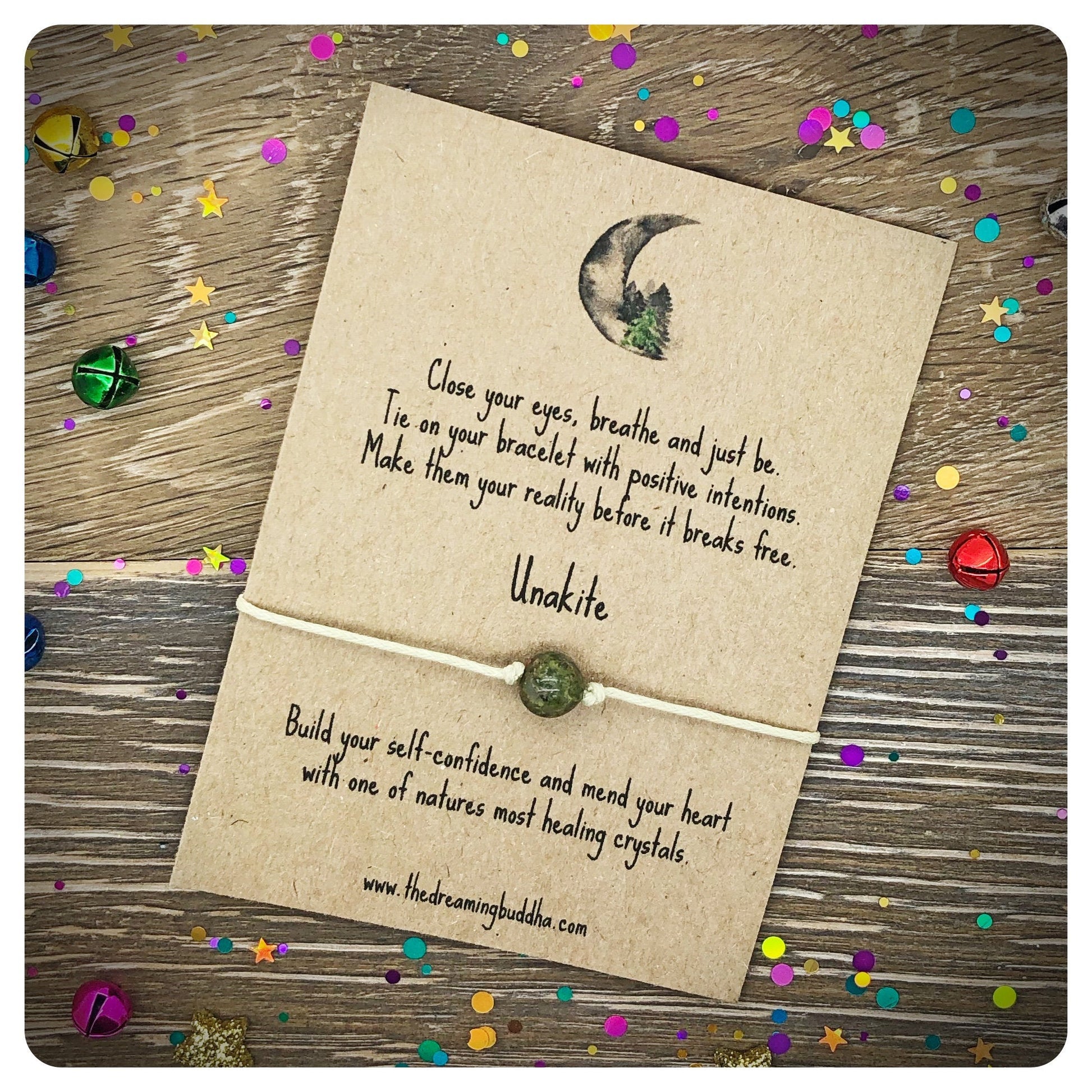 Each bracelet includes a genuine Unakite crystal bead and is made from quality 1mm waxed cord. The bracelet is mounted on recycled card and carefully wrapped in a clear cellophane sleeve. The whole package measures 11.5 cm by 9.5 cm.