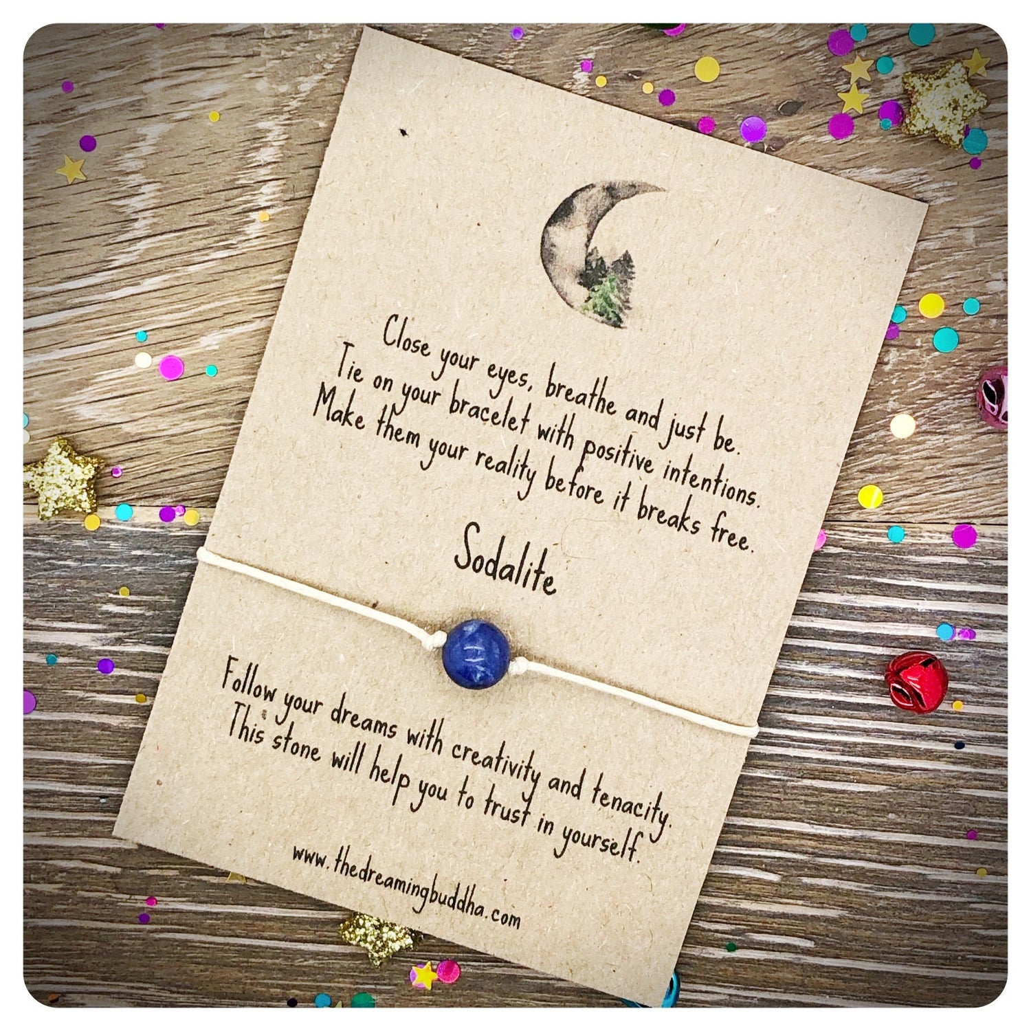 Each bracelet includes a genuine Sodalite crystal bead and is made from quality 1mm waxed cord. The bracelet is mounted on recycled card and carefully wrapped in a clear cellophane sleeve. The whole package measures 11.5 cm by 9.5 cm.