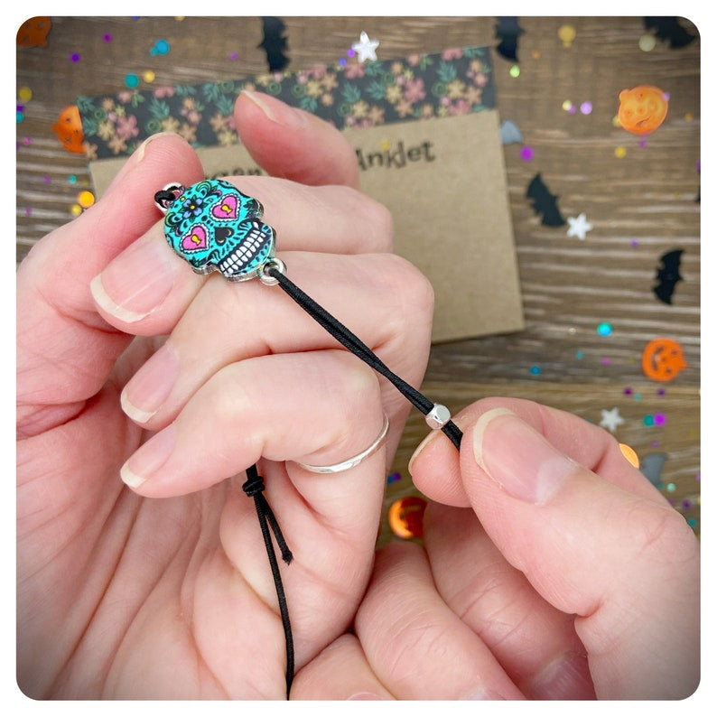 The anklet is adjusted via the two beads at each side of the enamel sugar skull charm.