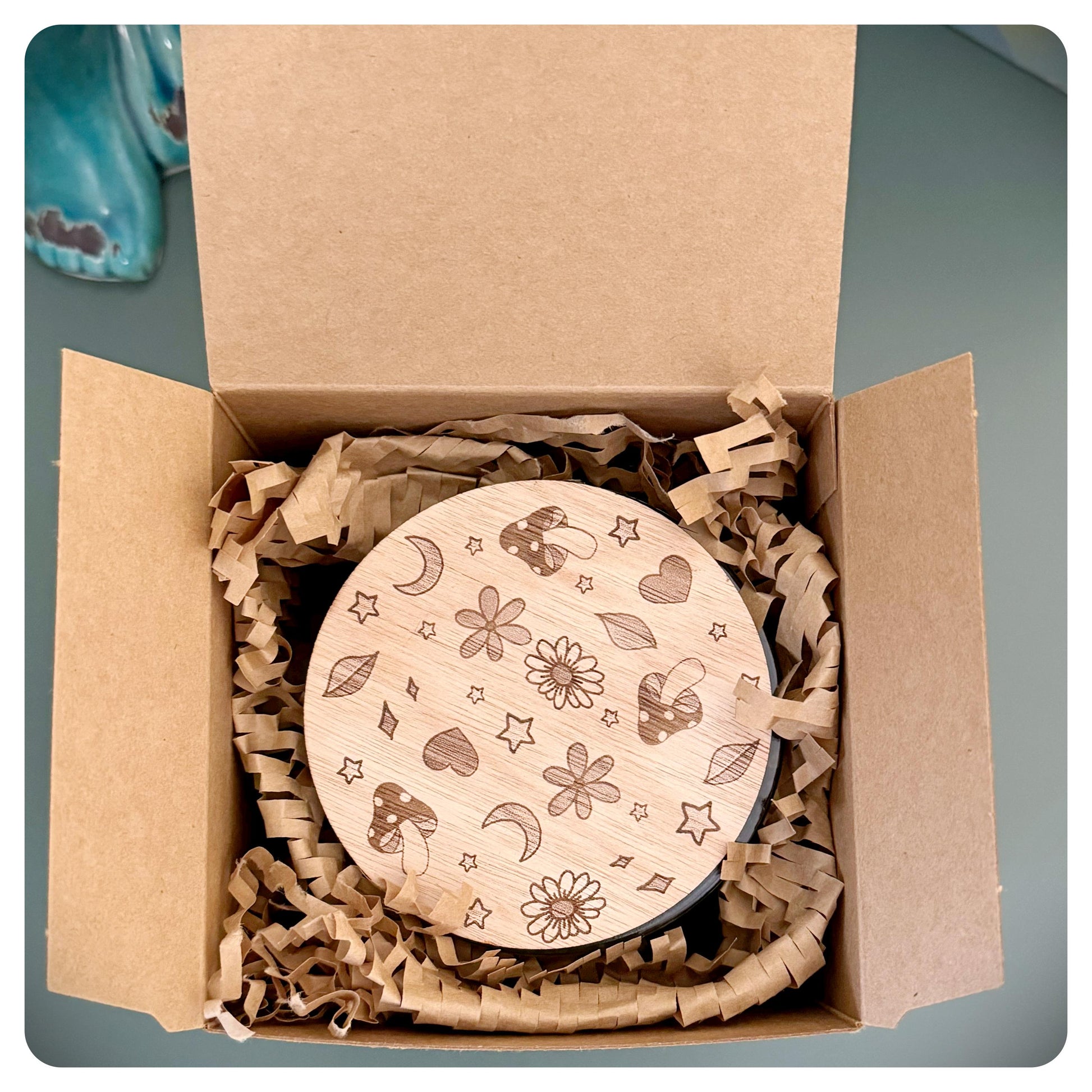 Lid: Add a heartfelt short message to the underside of the lid to give your gift a personal touch.