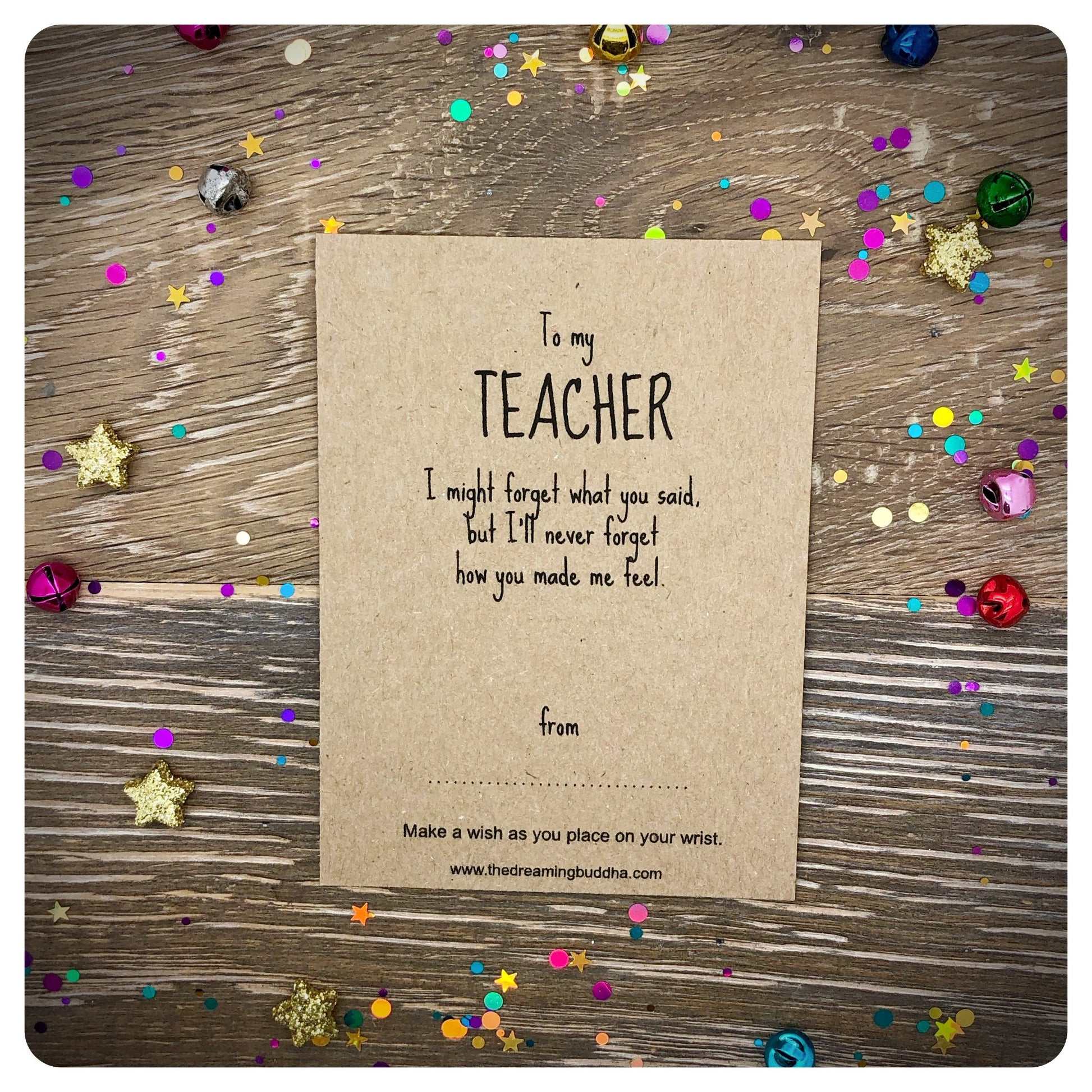 This handmade wish bracelet card reads - To my teacher. I might forget what you said but I’ll never forget how you made me feel.