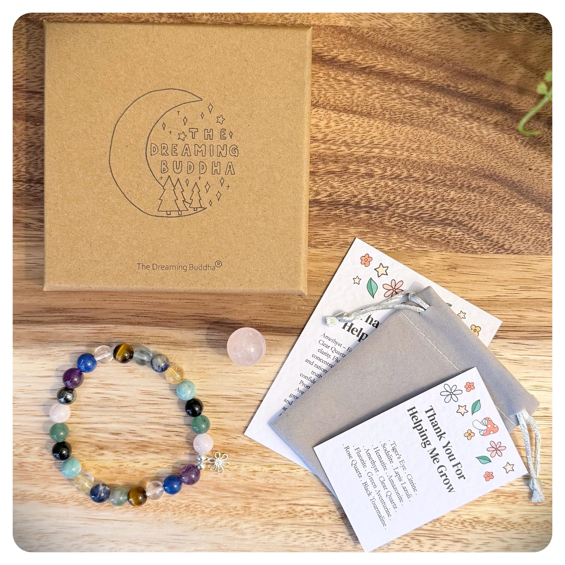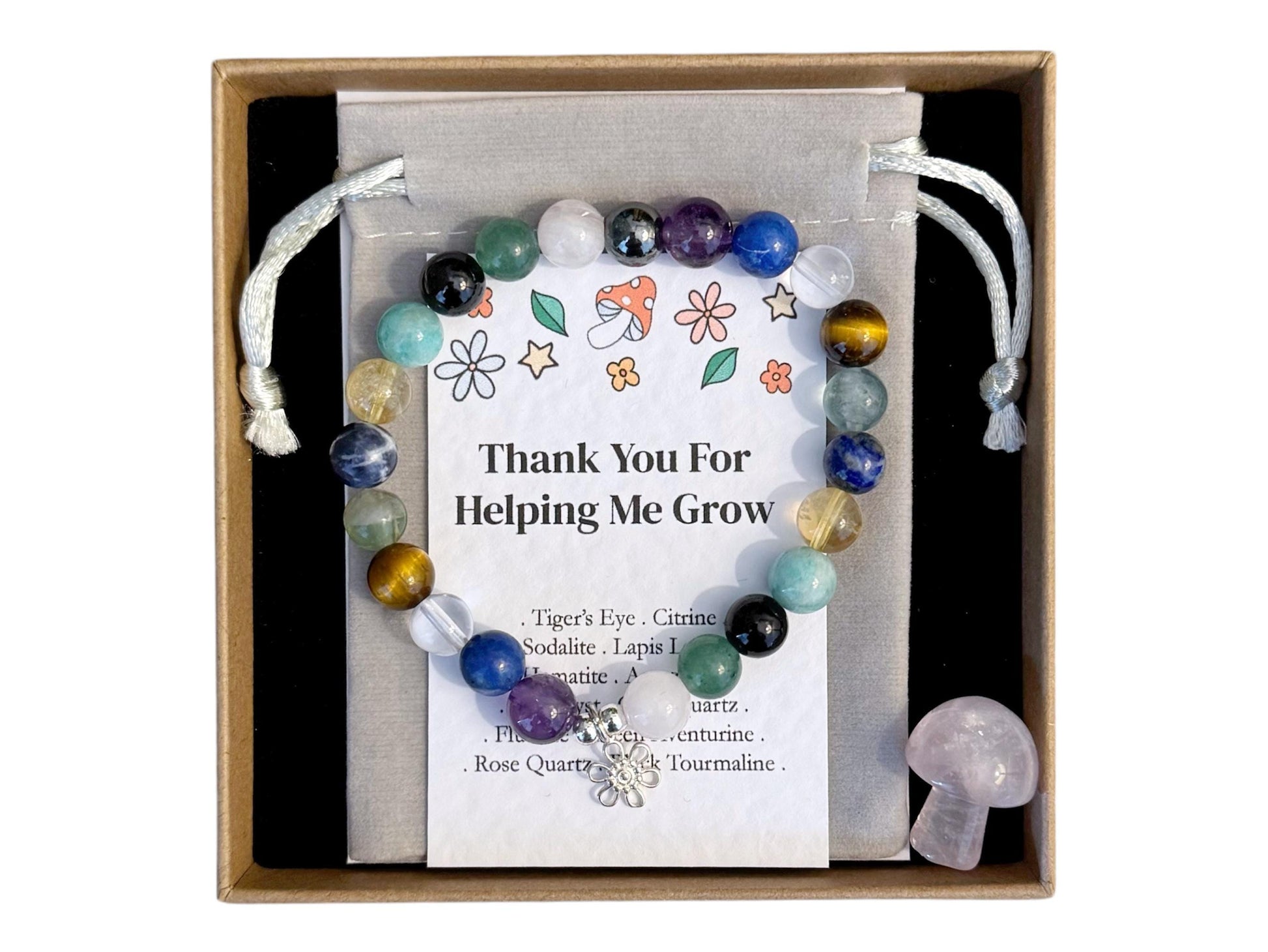 This handmade thank you for helping me grow bracelet is designed to inspire wisdom, patience, and positive energy. Featuring a thoughtful selection of natural crystals, this bracelet supports clarity, confidence, and emotional balance—perfect for those who dedicate themselves to guiding and educating others.