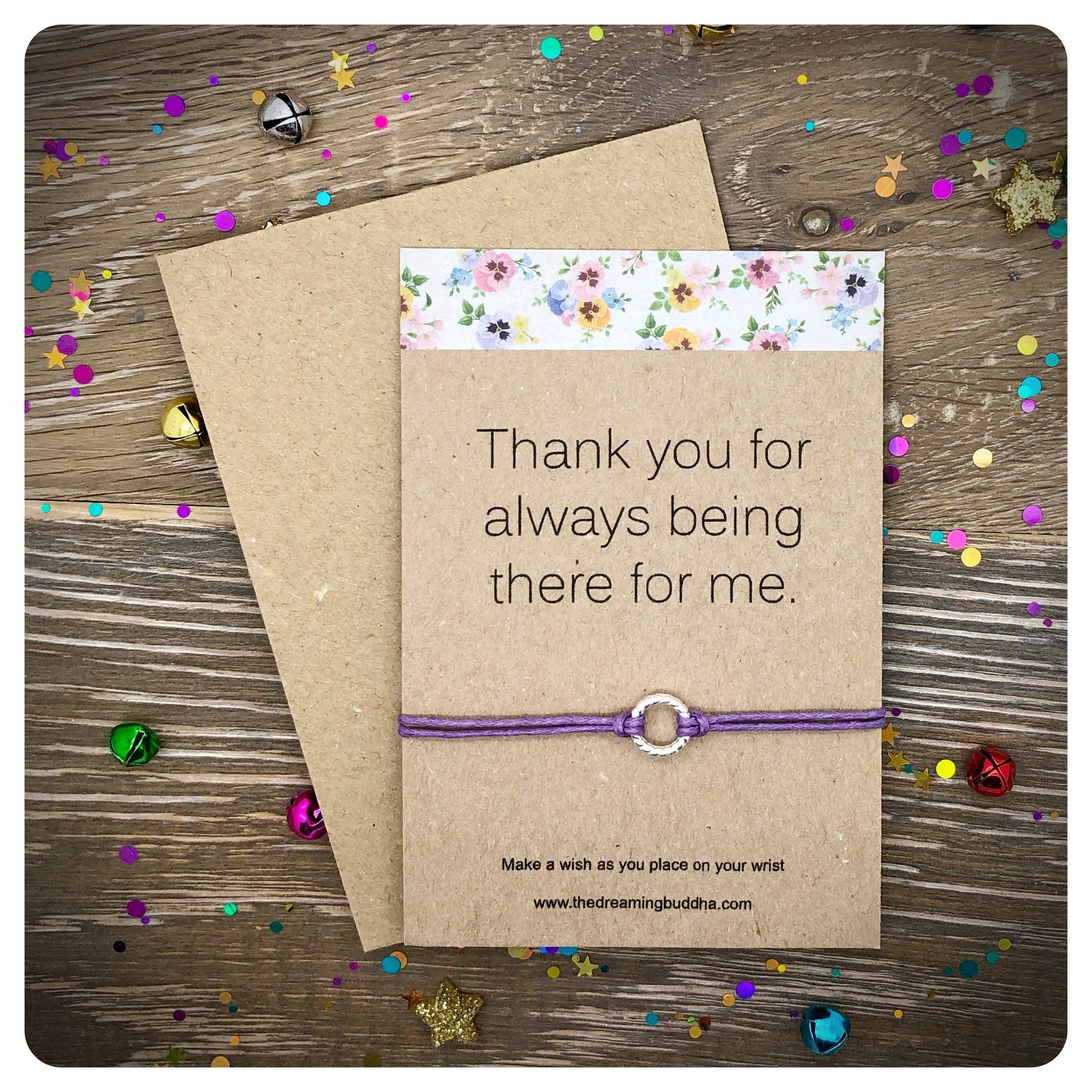 This handmade wish bracelet card reads - Thank you for always being there for me.
