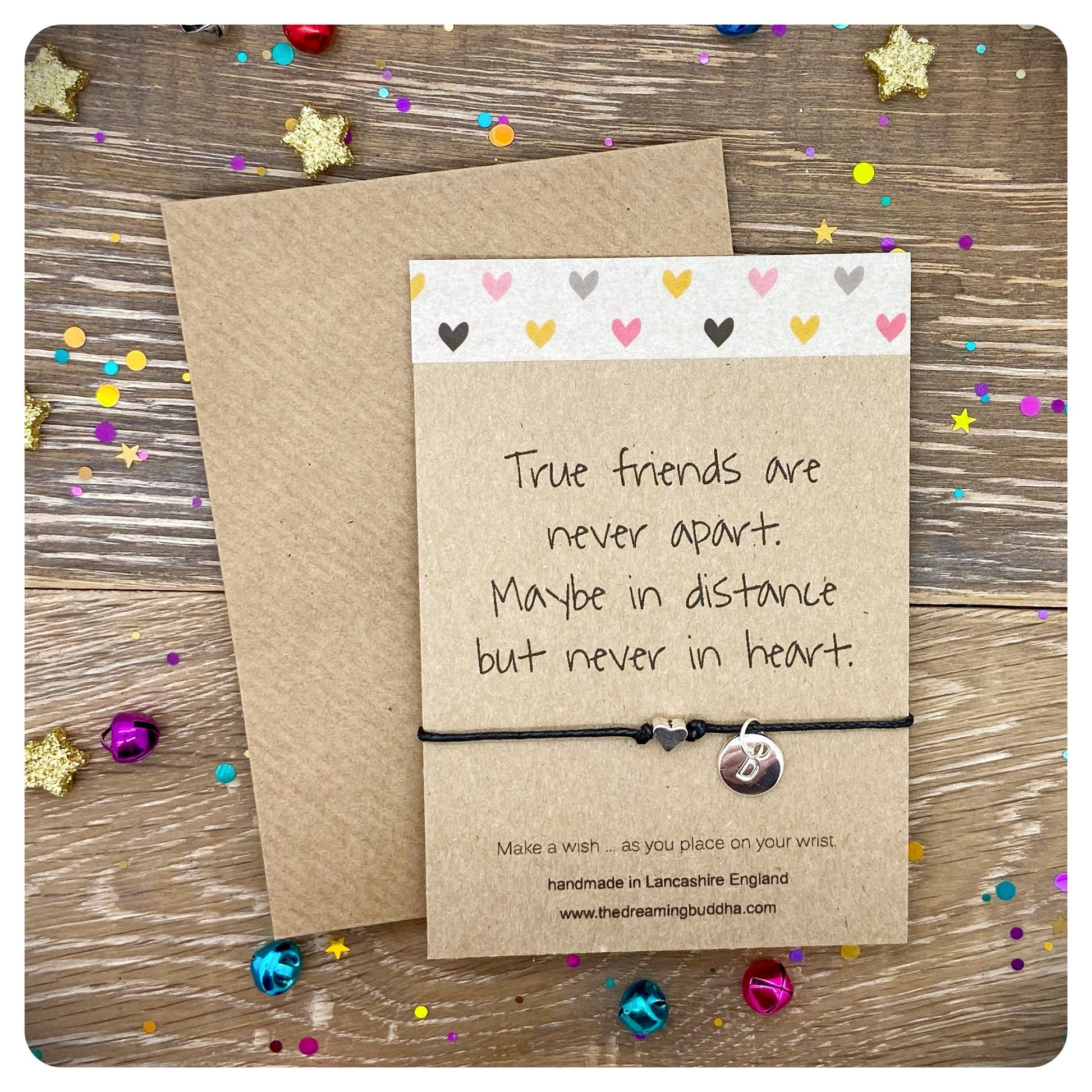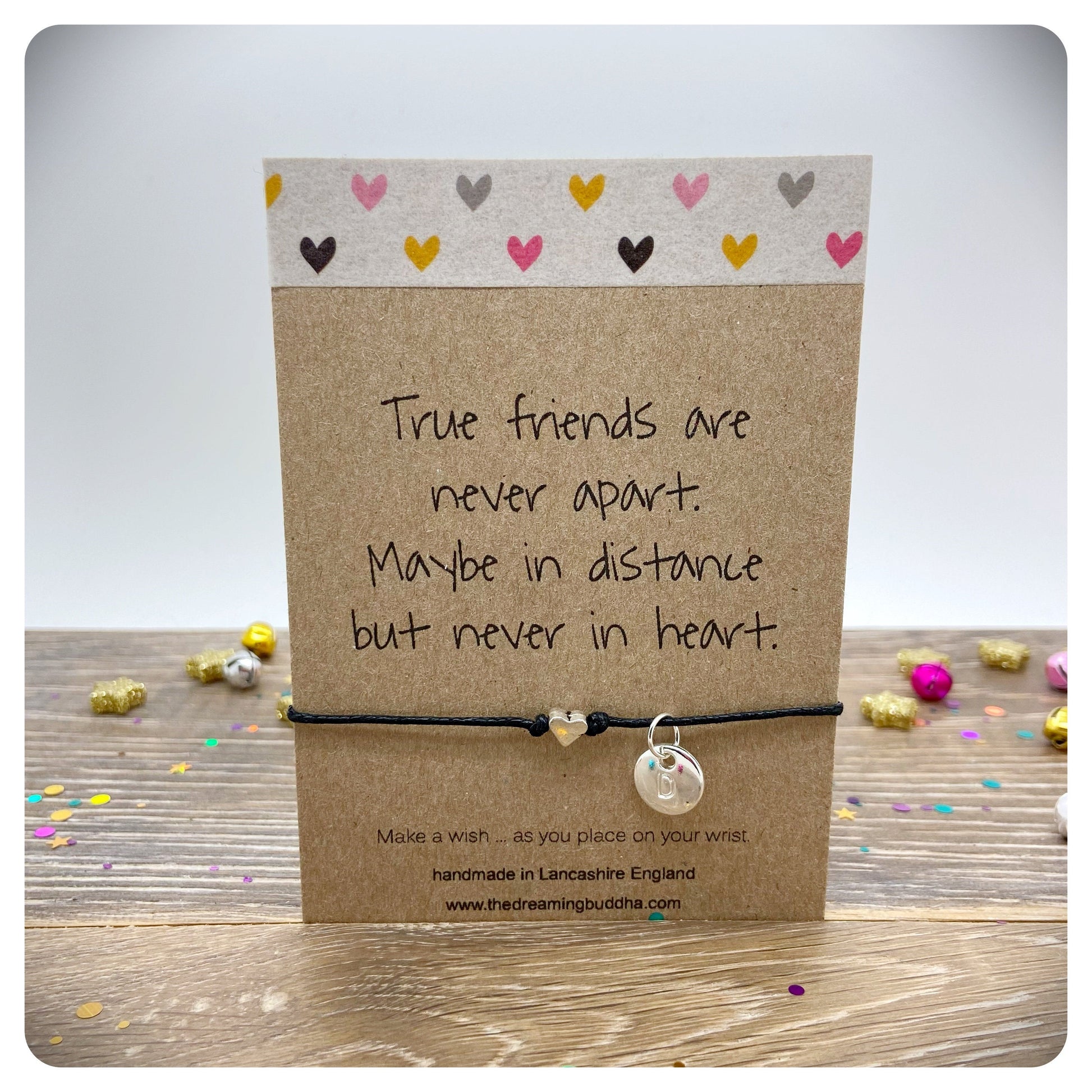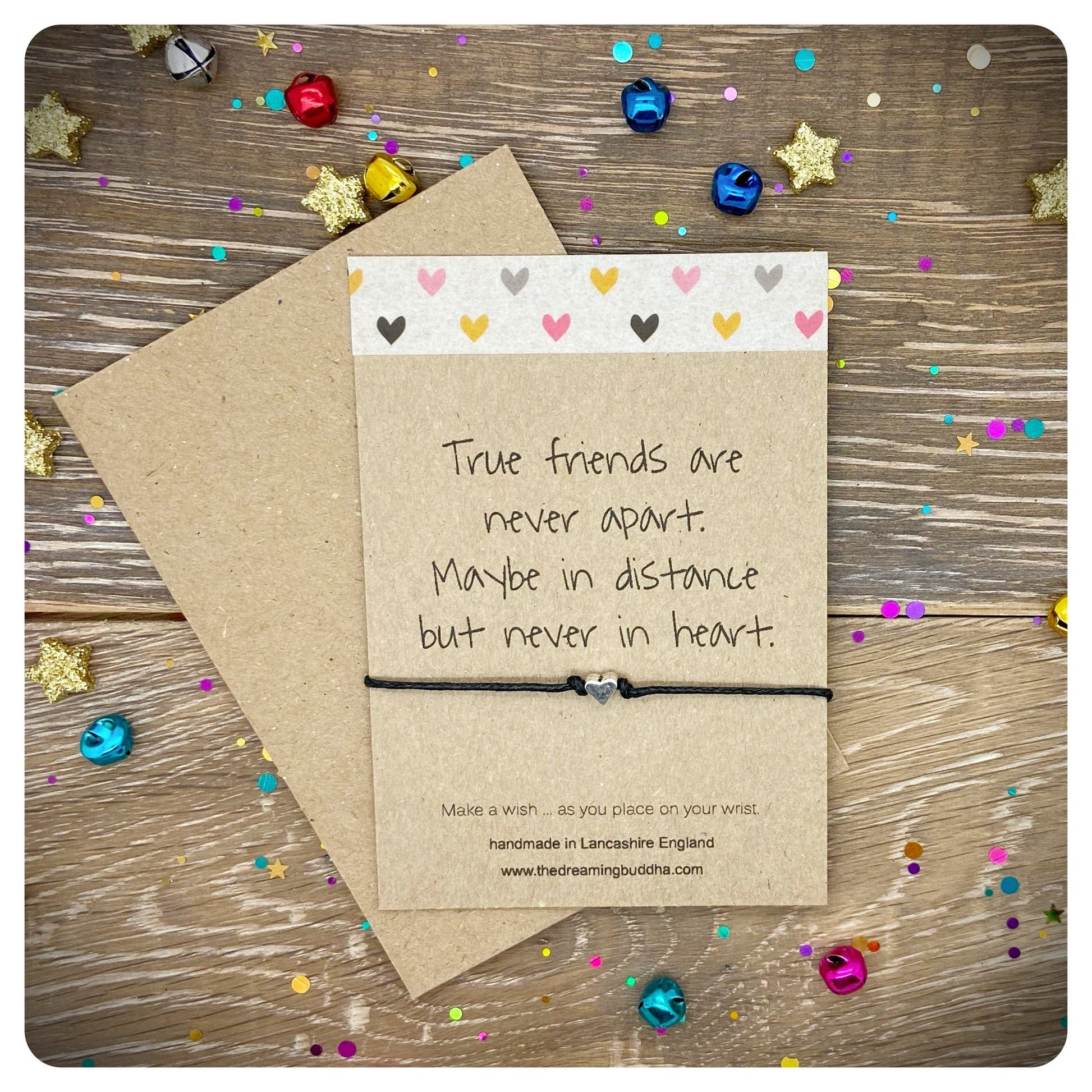 This handmade wish bracelet card reads - True friends are never apart, maybe in distance but never in heart.