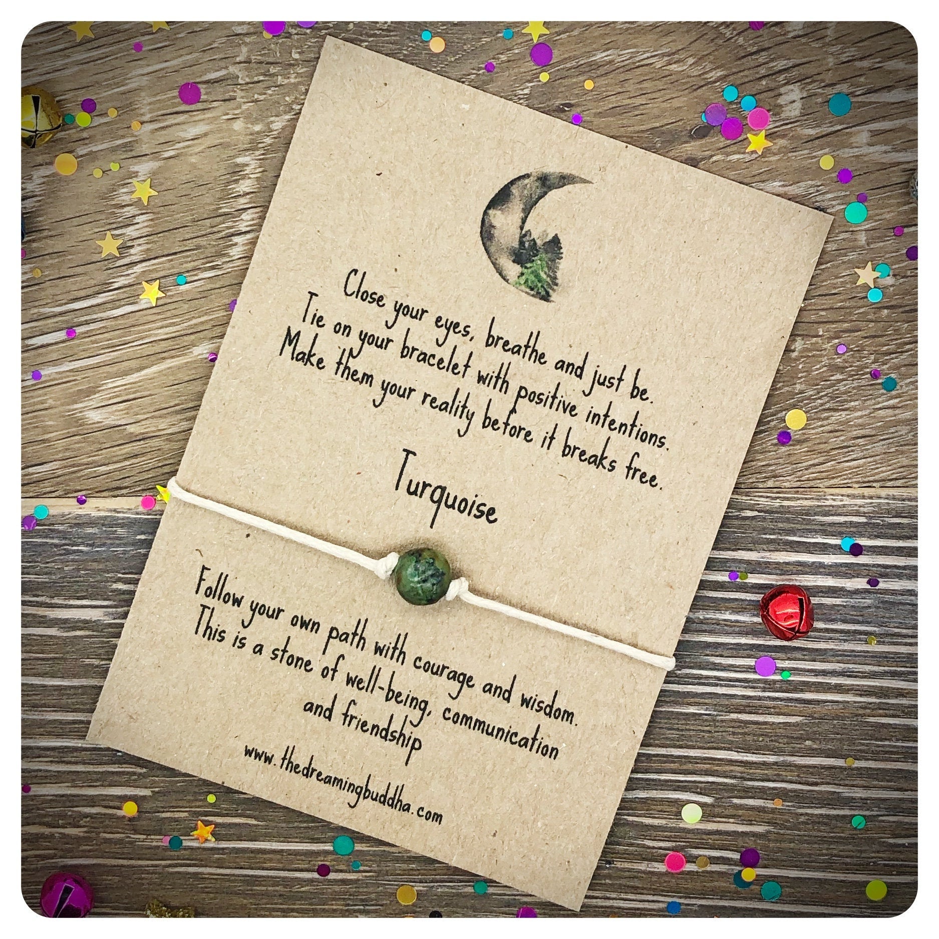 Each bracelet includes a genuine African Turquoise crystal bead and is made from quality 1mm waxed cord. The bracelet is mounted on recycled card and carefully wrapped in a clear cellophane sleeve. The whole package measures 11.5 cm by 9.5 cm.