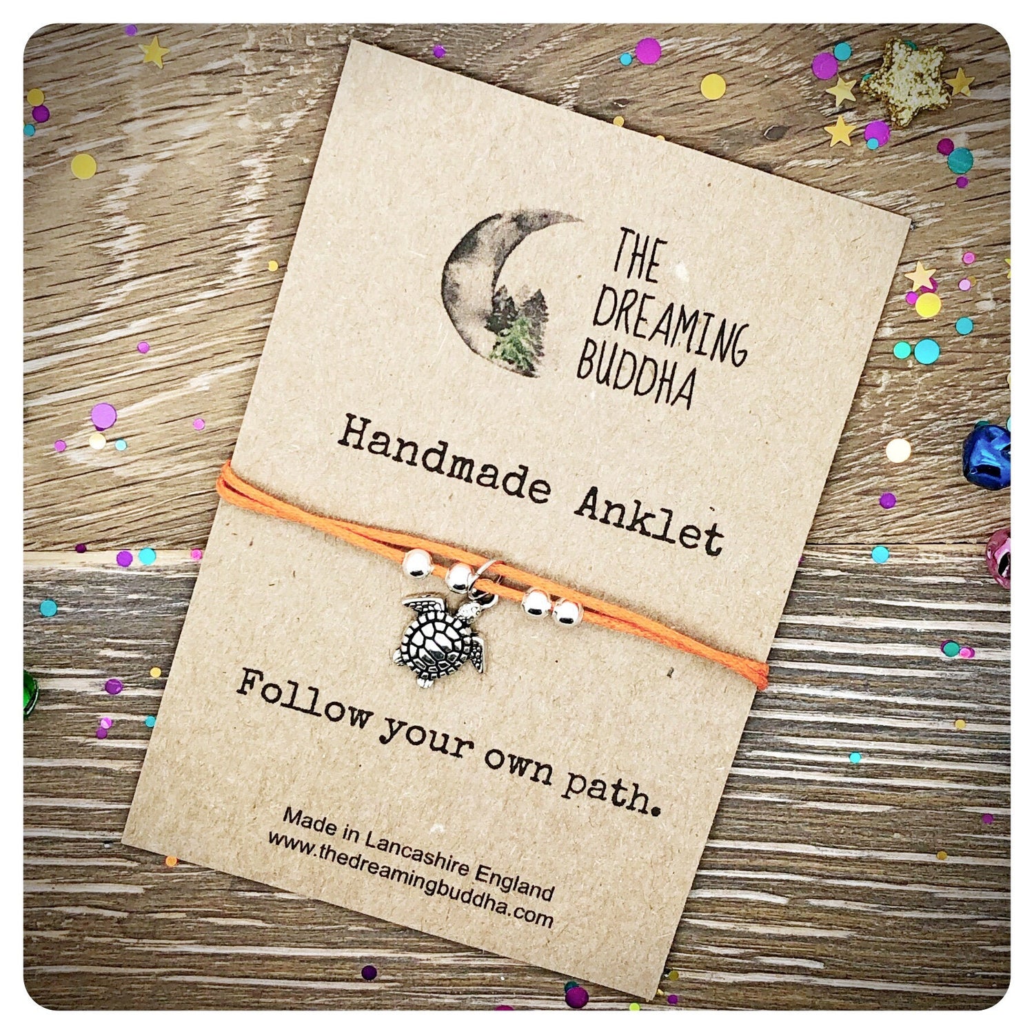 The anklet is mounted on recycled card and carefully wrapped in a clear cellophane sleeve. The whole package measures 11.5 cm by 9.5 cm.