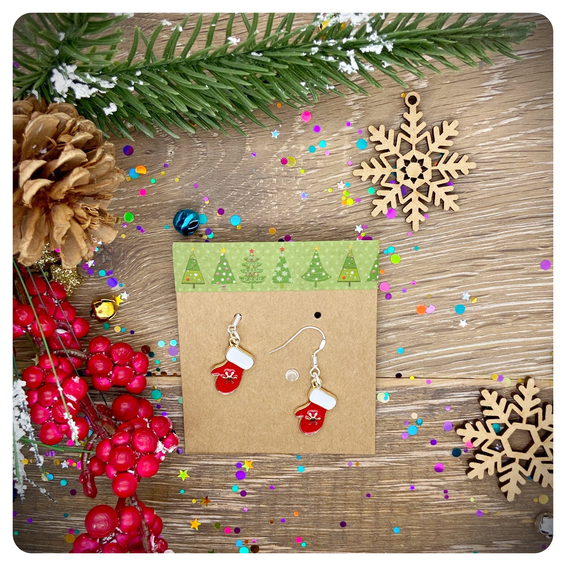 Christmas Mittens Dangle Earrings, Red Gloves Festive Jewellery, Cute Stocking Filler, Enamel Charm Drop Earrings