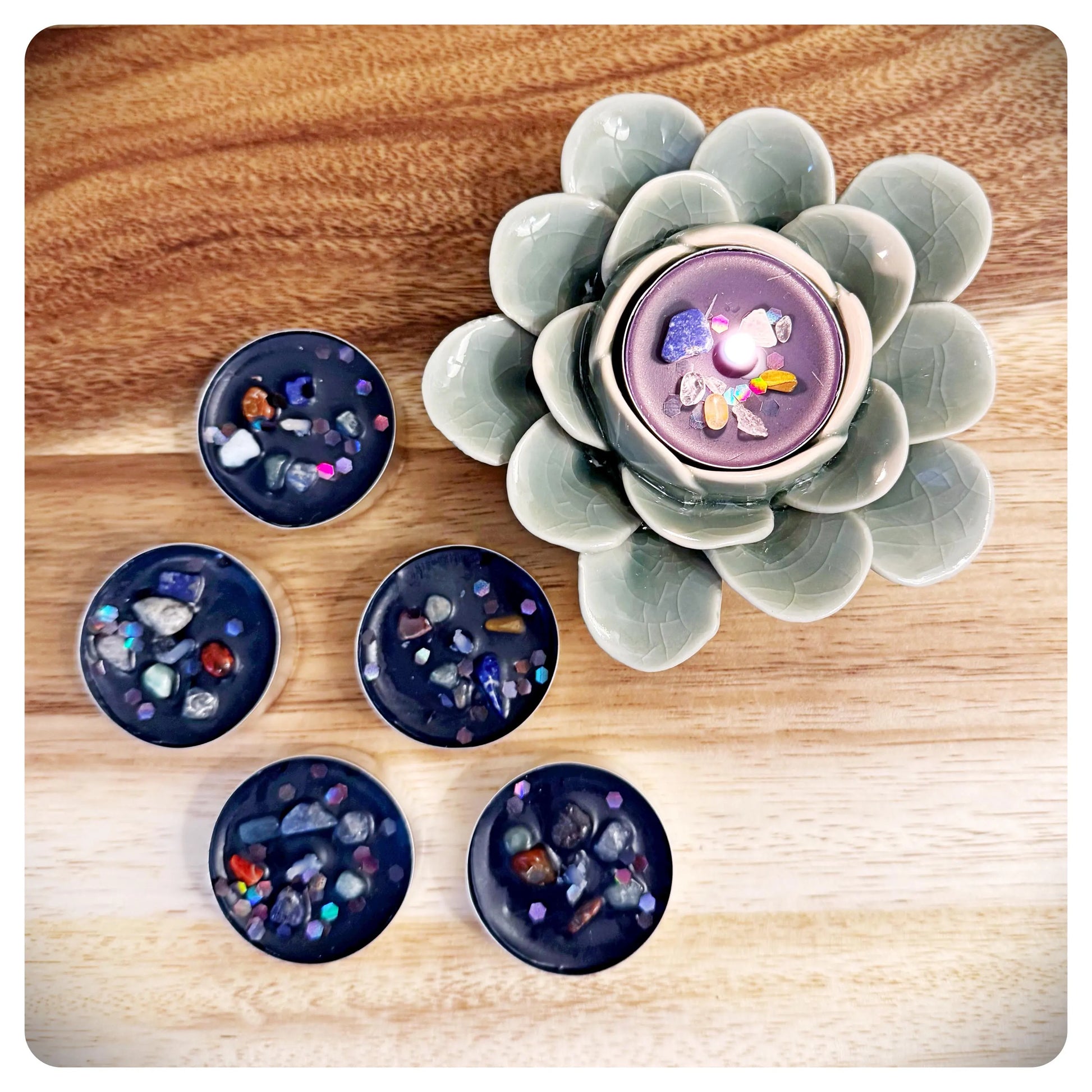 Two Dark Tea Lights: Infused with crystals and biodegradable glitter, these tea lights set a magical ambiance.